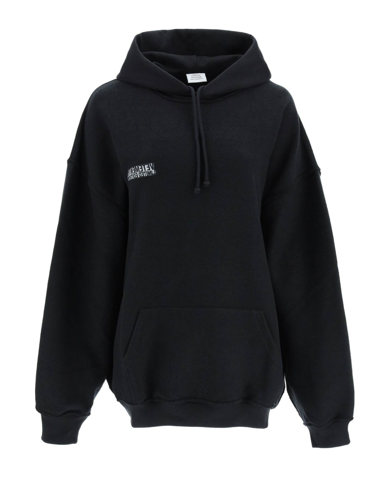 Vetements oversized French terry sweatshirt boasting an inside-out construction. Drawstring hood, kangaroo pocket, embroidered logo on the chest. The model is 177 cm tall and wears size XS. Composition: 80% CO, 20% PL