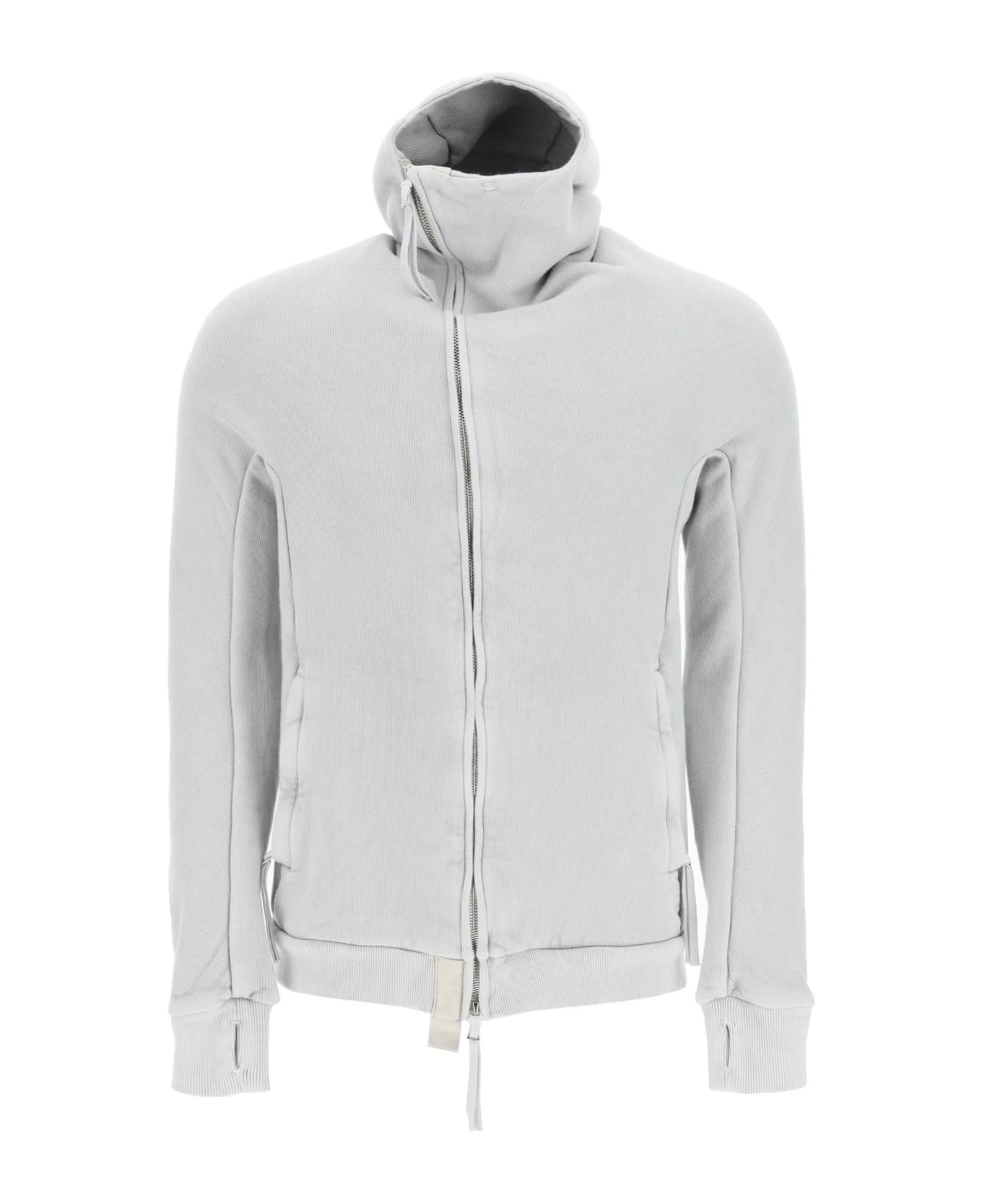 Zip-up hoodie in brushed-back ribbed cotton jersey by Boris Bidjan Saberi, handcrafted and natural object-dyed. It features asymmetric two-way zip closure and side zipped welt pockets. Balaclava hood, rib-knit hem and thumbhole cuffs. Signature drawstring detail at back and sterling silver hardware. Webbing shoulder straps and two pockets on the inside. Slim fit. The model is 187 cm tall and wears a size L.