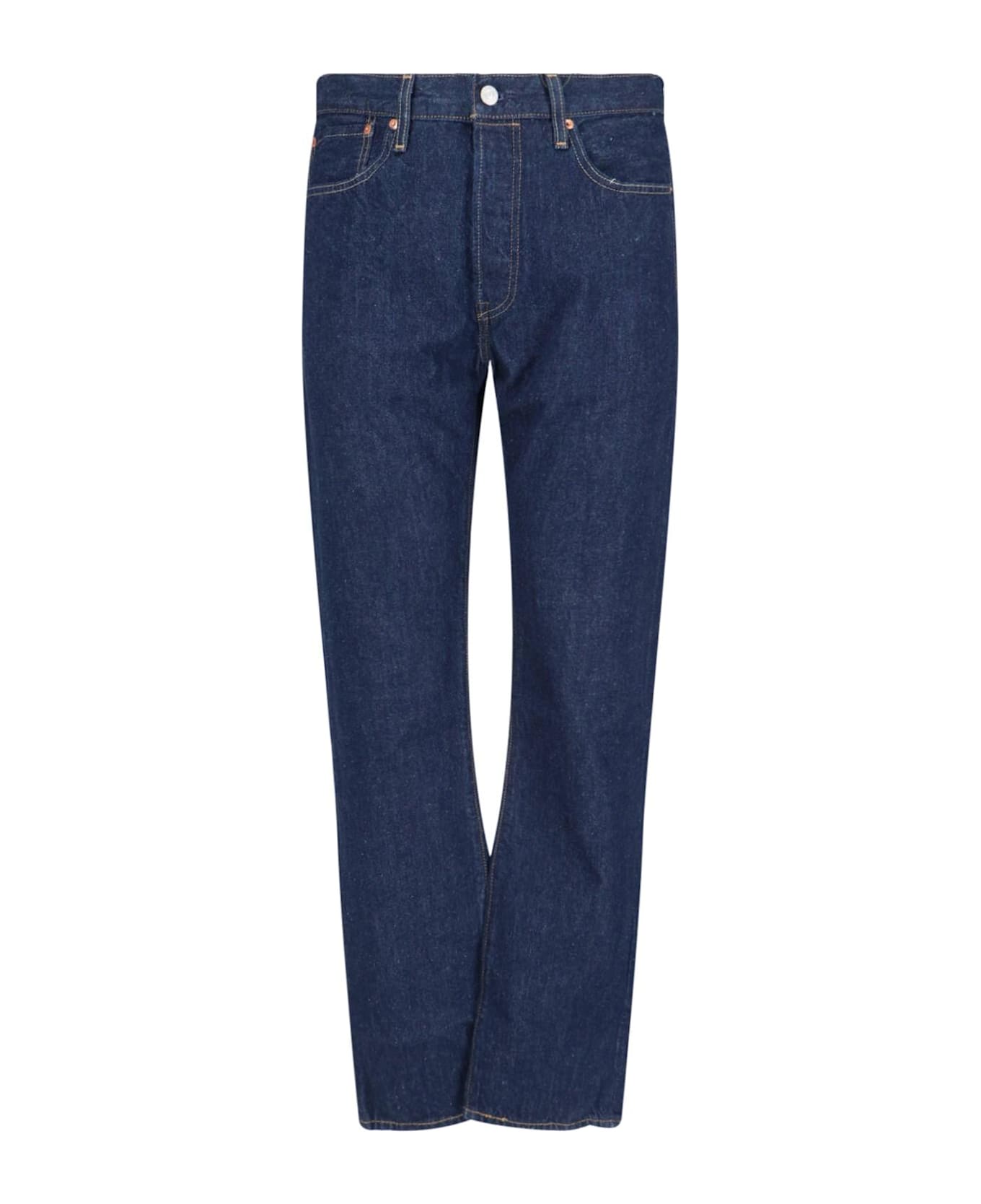 Levi's Strauss 501 blue cotton jeans with belt loops, button closure, five pocket design, back logo label, straight leg, straight hem. 100% cotton