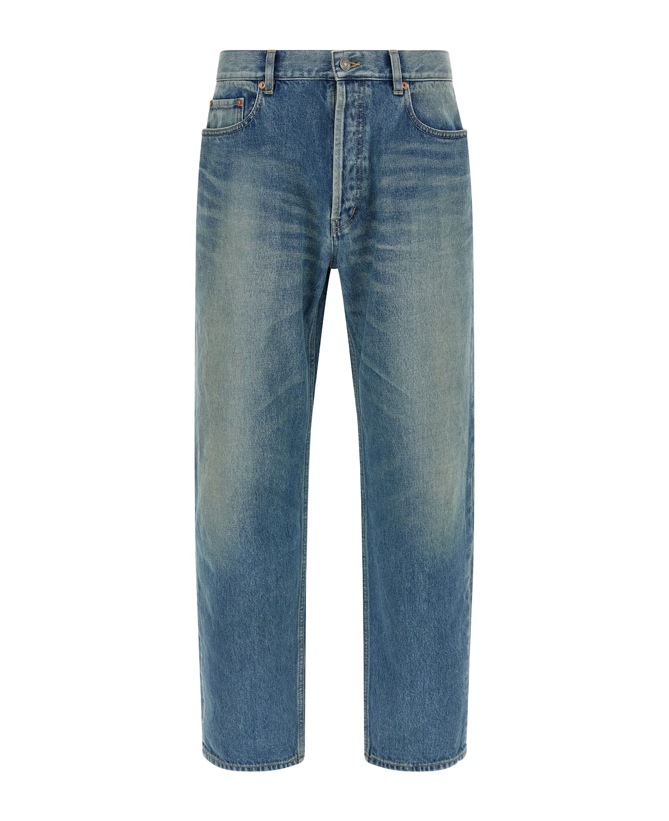 Mick jeans in stone-washed cotton denim with contrast stitching, mid waist, straight leg, front button closure, five pockets, and leather logo label at the back. Composition: 100% cotton