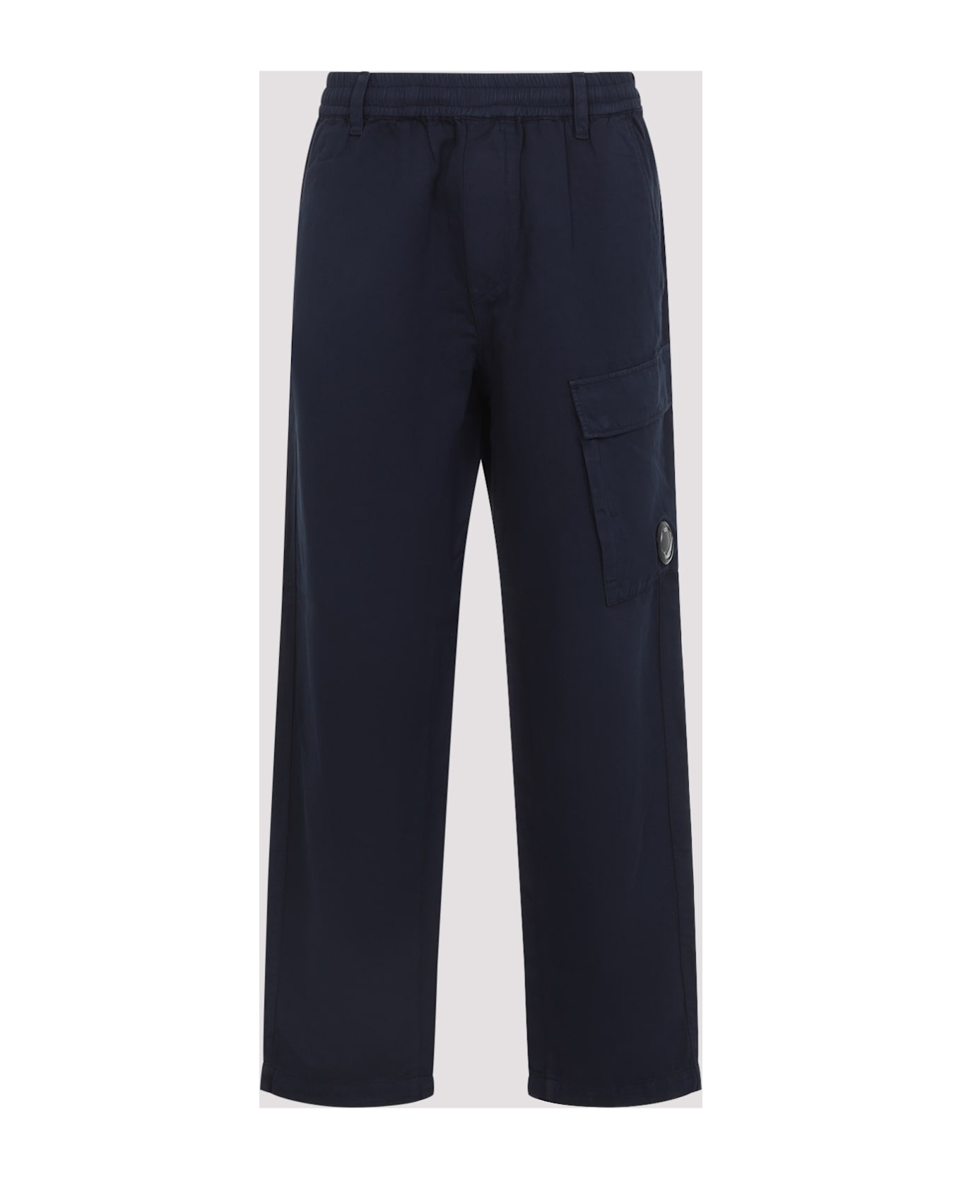 CP Company Blue Cotton Cargo Pants. Crafted from dark blue cotton and linen, featuring an elastic waist, belt loops, in-seam side pockets, a cargo pocket with CP Lens on the side, a flap pocket on the back, a mini branded label on the back, and a straight leg.