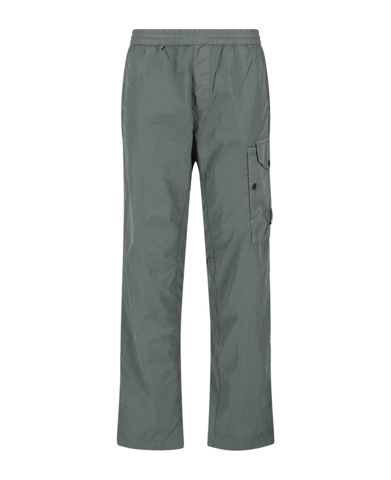 C. P. Company straight pants in gray fabric with elastic waistband, two side pockets, side patch pocket, side logo hardware detail, back thread pocket, mini logo patch back, straight leg.