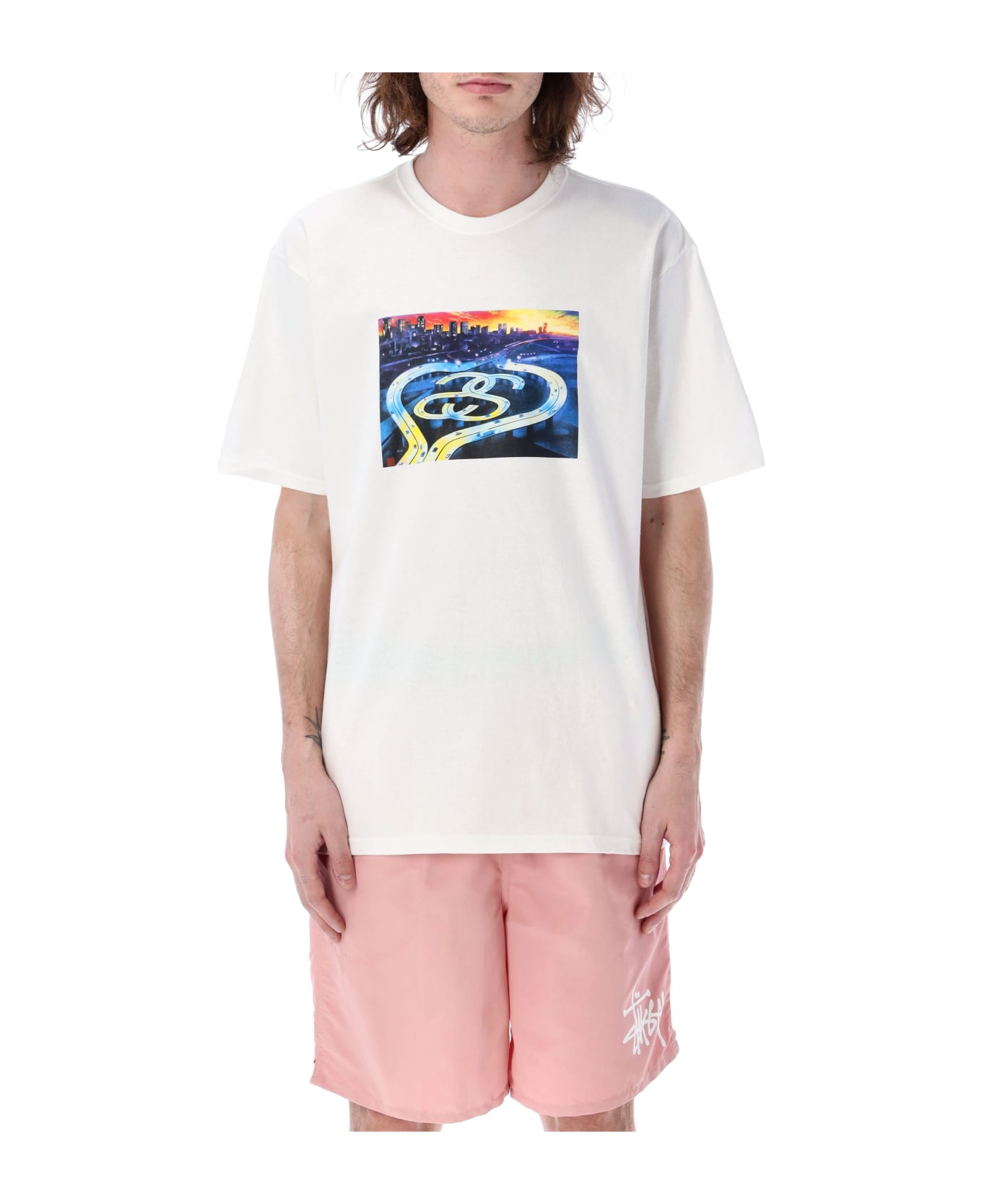 Cotton Highway T-shirt By Stüssy. Featuring: Ribbed Crew Neck Short Sleeves Multicolor Graphic Print At Front Slogan Print At Back Straight Fit The Model Is 1,90 M Tall And He's Wearing Size L