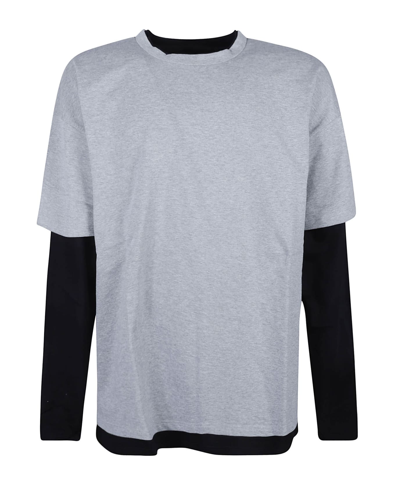 logo-print cotton T-shirt from JIL SANDER featuring grey, black, cotton, two-tone design, logo print to the rear, text print, round neck, long sleeves, double sleeves and straight hem. Composition: 100% Co