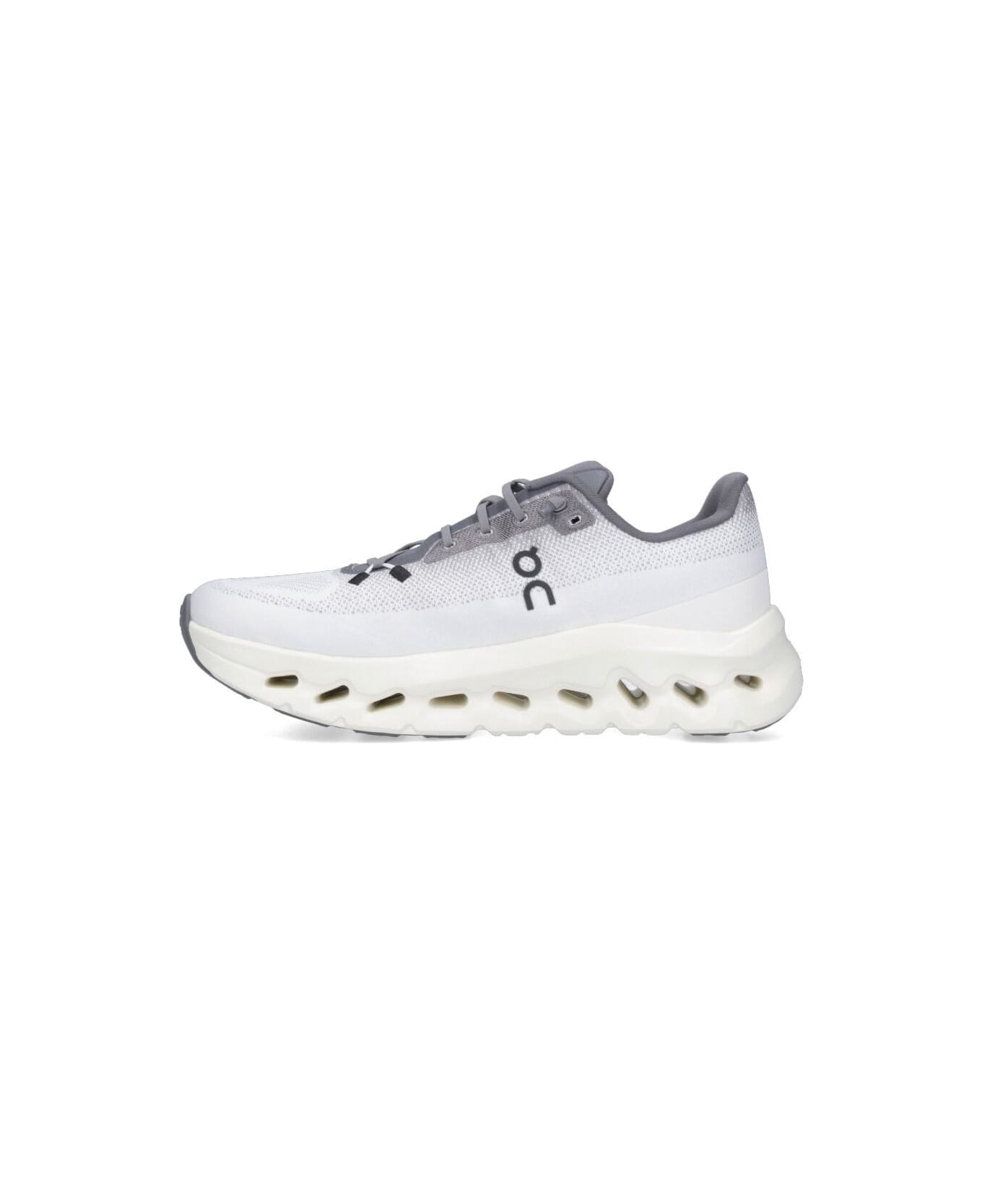 On 'Cloudtilt' sneakers in white fabric with grey top details, round toe, contrast logo embroidery detail, lace-up closure, logo embroidery on the tongue, side and back logo embroidery, mini Swiss Engineering label on the back, textured rubber sole, embossed logo detail on the side.