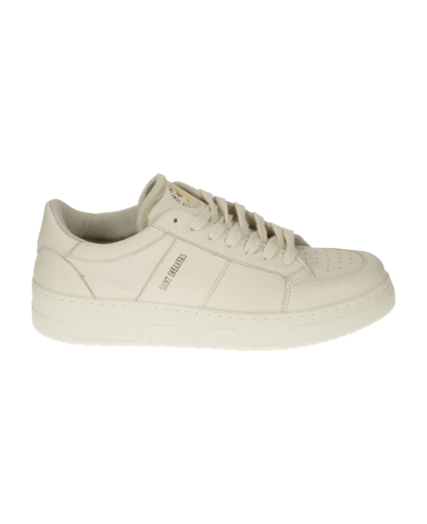 `SAINT SNEAKERS leather sneakers, lace-up, perforated round toe, side logo script. `