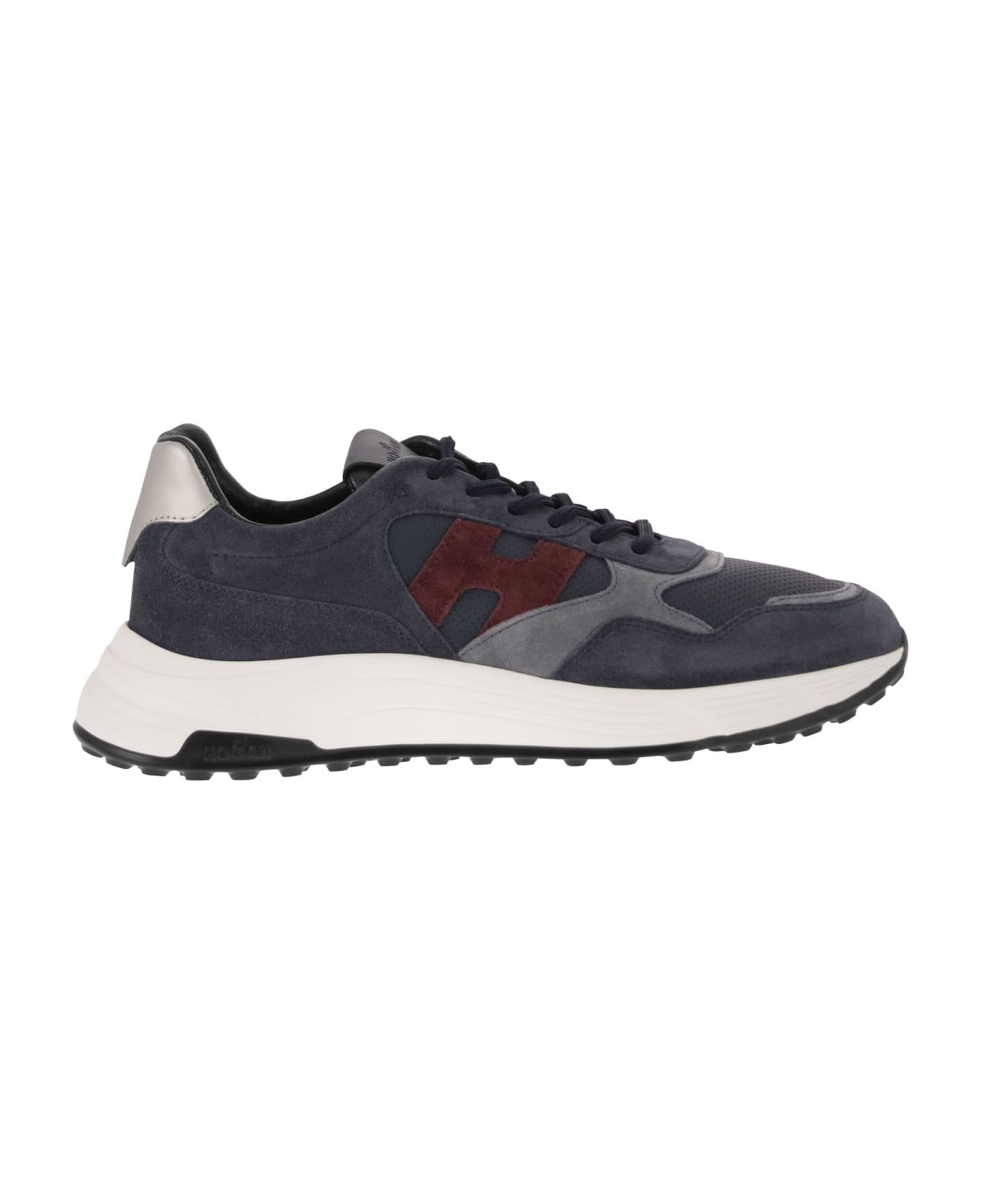 Characterized by fluid and snappy shapes, the Hogan Hyperlight trainers combine the lines of a jogging shoe with elements of an urban vocation. The suede and smooth leather upper, with punched inserts and lateral H, evokes the brand's iconic details. An ultra-dynamic model with a memory foam midsole and a light sole with cleats that recall the historic H383 model. - Made in Italy - Suede leather upper - Smooth leather inserts - Suede leather lateral H - Laminated leather details - 8 mm memory foam footbed - Rubber sole - Fabric pouch included DESIGNER ID: HXM5630ER90S9D914K