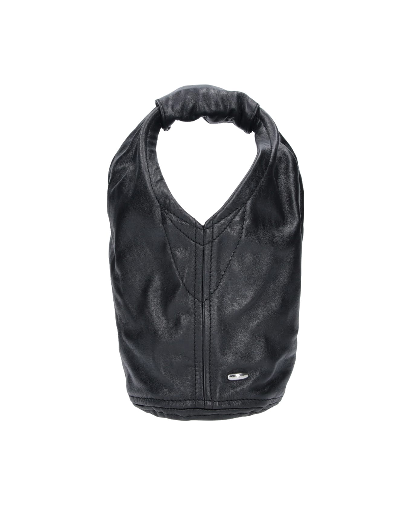 Fofo Drip bag Our Legacy in black bull leather, top handle, silver metal detail, and main inner compartment.