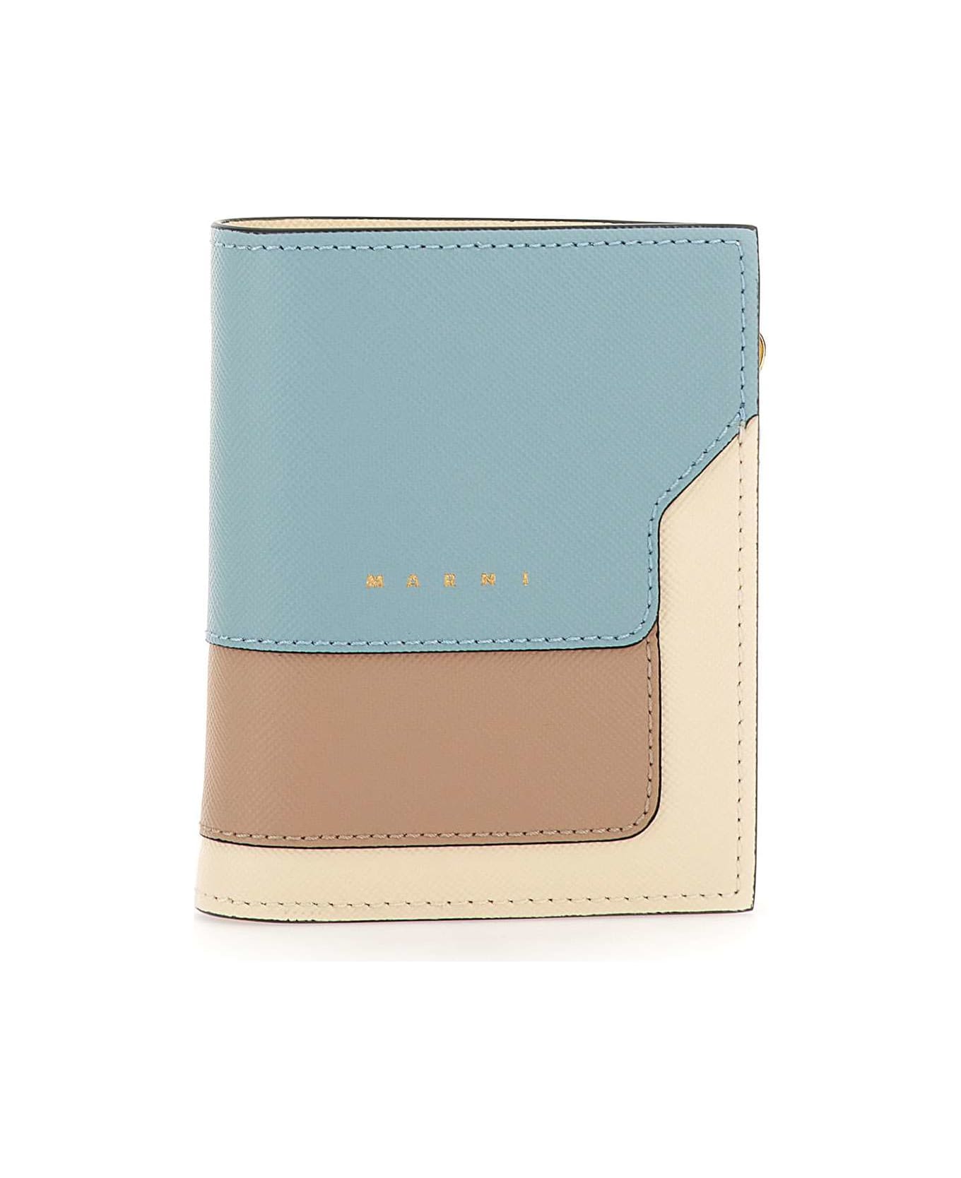 Marni "Billfold" leather wallet, multicolor in shades of light blue aquamarine, cream and taupe, four card slots, extra pockets, compartment for banknotes, gold hardware, front gold logo, button closure, coin pocket with zip. Measurements: length 11cm, height 8cm. Made in Italy. Case included.