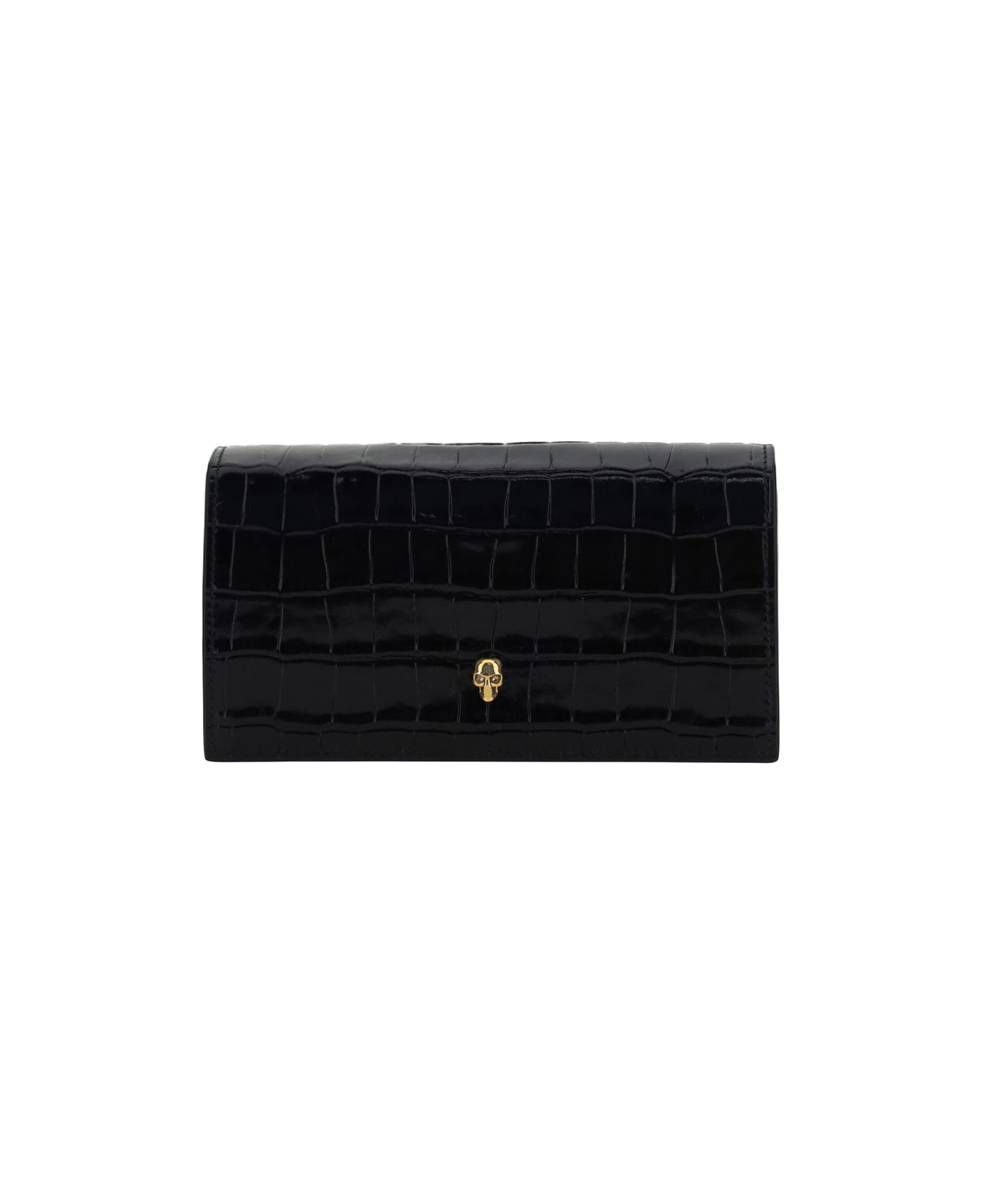 Calfskin wallet by alexander mcqueen, shiny crocodile-effect leather design, front snap-button closure, interior coin compartment, interior card slots, iconic brand skull applied contrasting embossing on front, iconic brand monogram stamped inside.