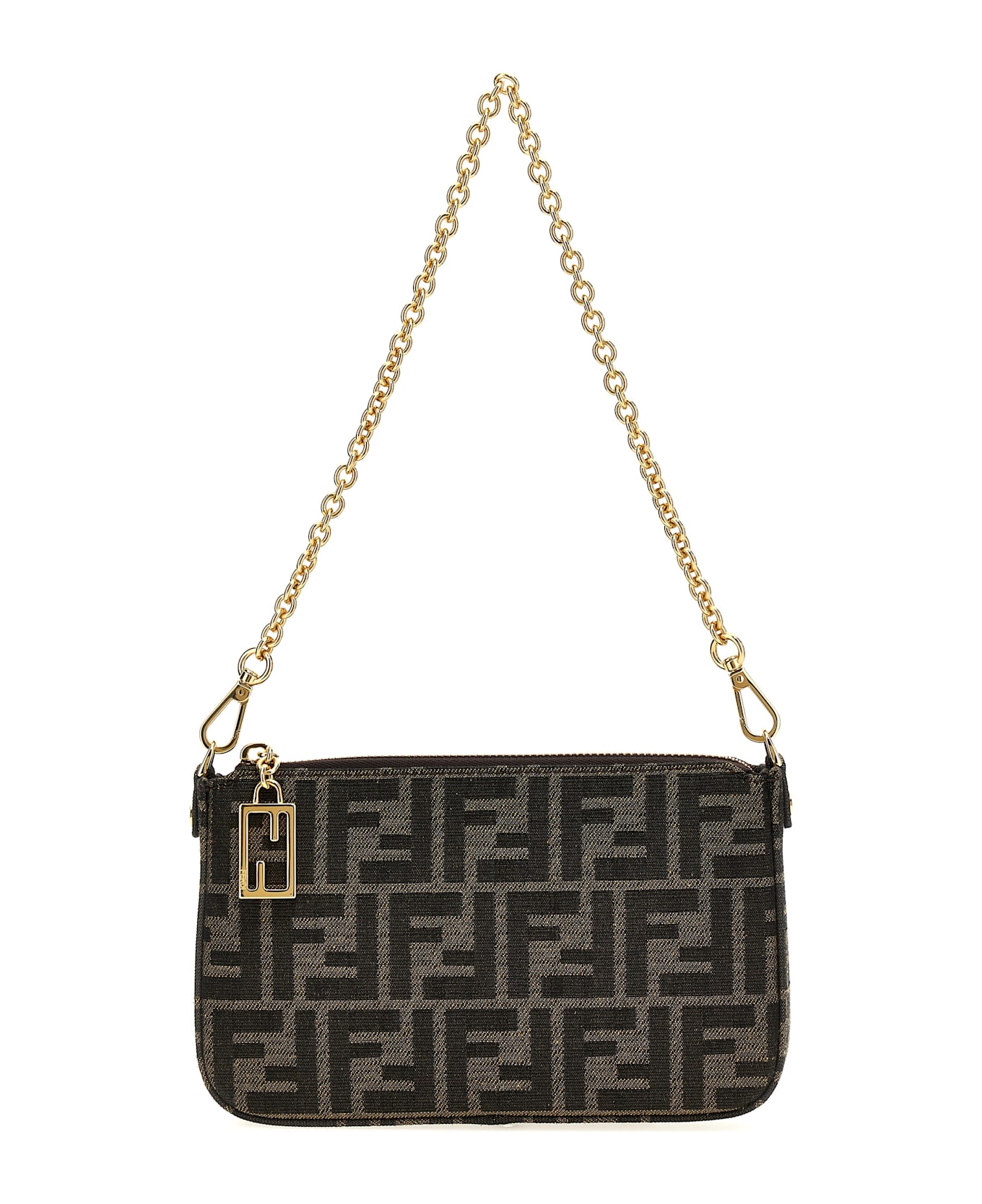 'Baguette' fabric pouch with jacquard FF pattern, zip closure, removable short chain handle, adjustable and removable long leather shoulder strap. Composition: 27% polyester 27% polyamide 27% polyurethane 15% cotton 4% res