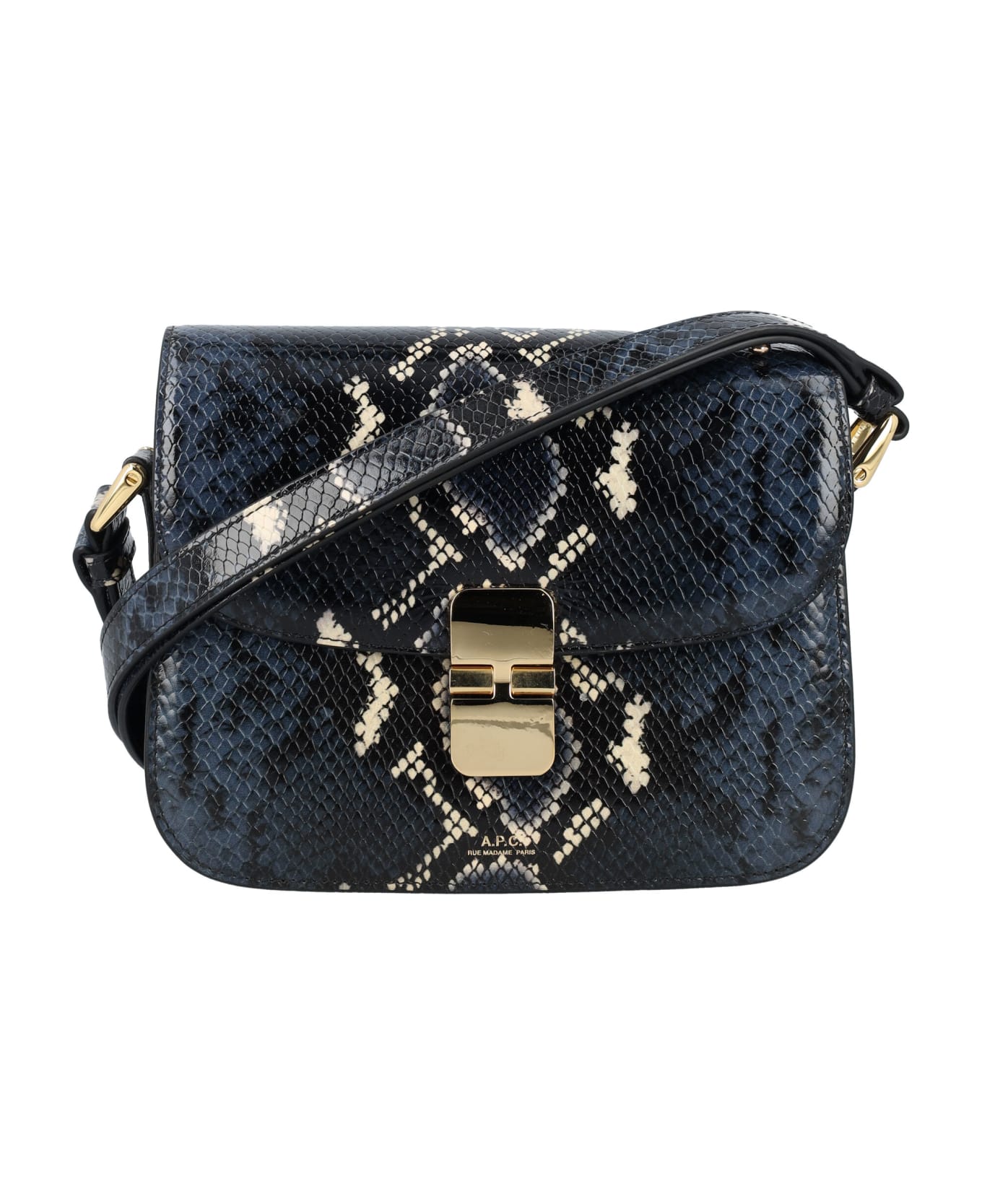Grace Small Bag By A. p. c.. Featuring: Embossed Leather With Python Motif Frontal Flap With Goldtone Hardware Clasp Closure Adjustable Leather Shoulder Strap Goldtone 'a. p. c. Rue Madame Paris' Logo At Front One Large Compartment Two Large Pockets Cowhide Split Leather Under Flap Gold-toned Hardware Width: 21 Cm Height: 16 Cm Depth: 5 Cm