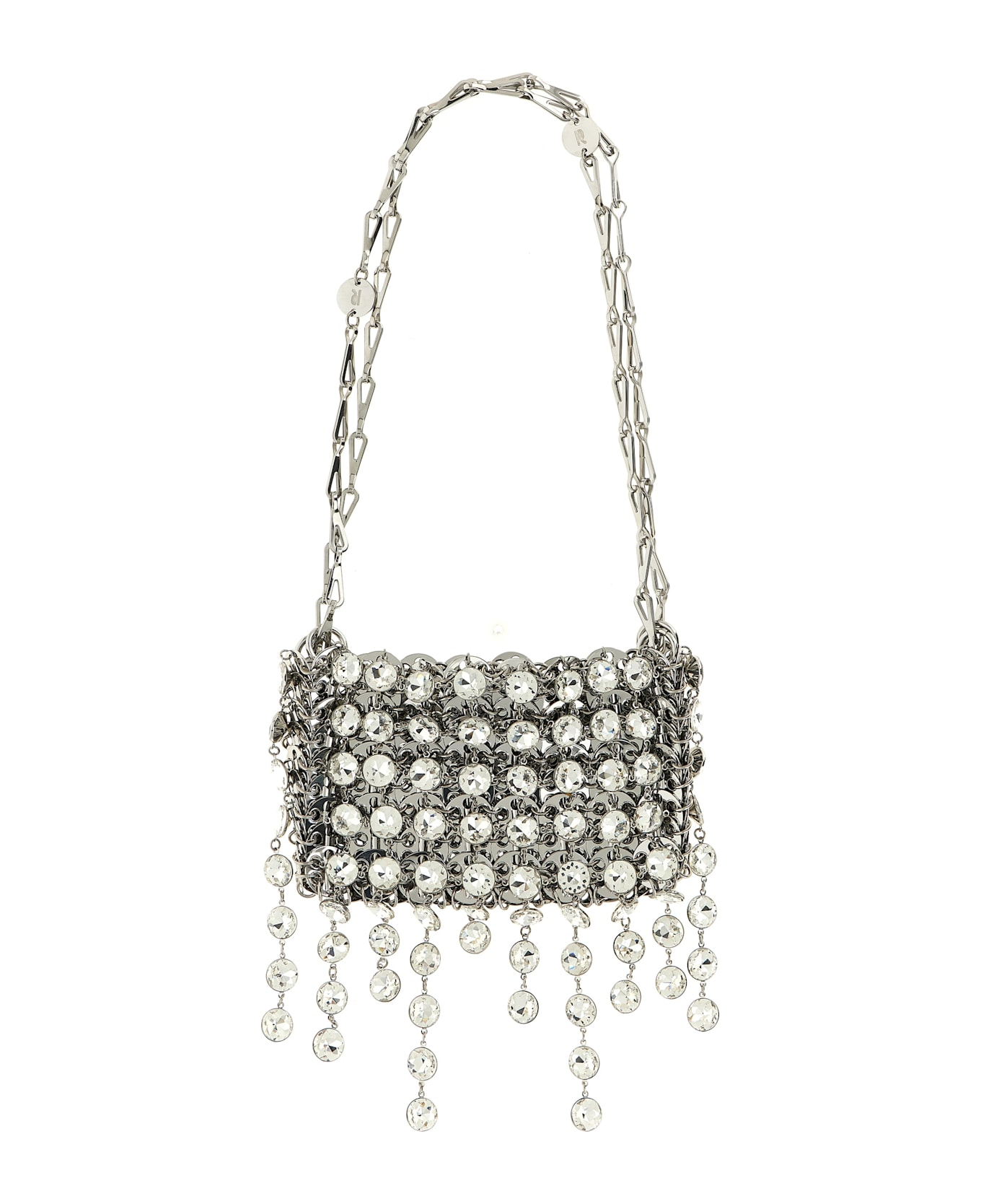 '1969 Strass Nano' shoulder bag in metal mesh and front pendant crystals, double sliding handle, magnetic closure.