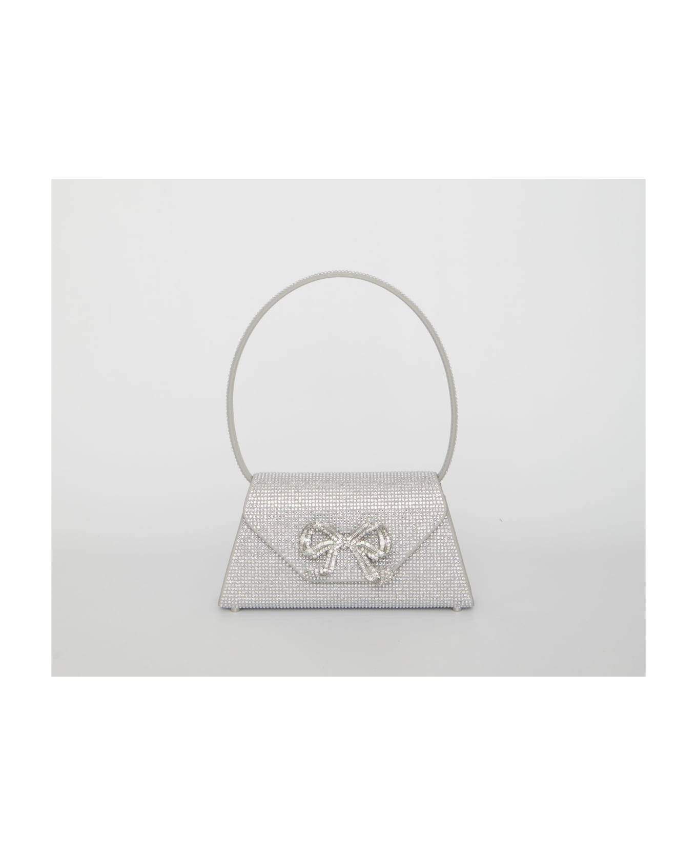 Bow mini shoulder bag in silver-tone synthetic leather covered with rhinestones with bovine leather trims. It features detachable top handle, front flap with silver bown and magnetic closure, one main interior compartment and one interior card slot.