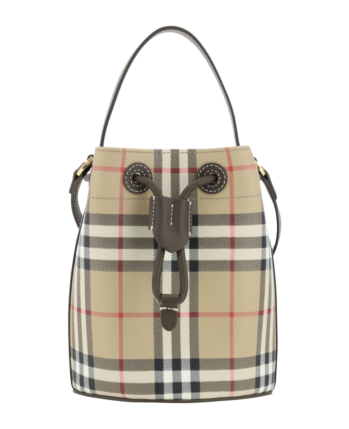 Bucket bag by burberry, leather drawstring top closure, flat top handle, flat and adjustable leather shoulder strap, iconic all-over printed check archivio pattern, brushed metal hardware, single compartment. Composition: 100% % Fabric