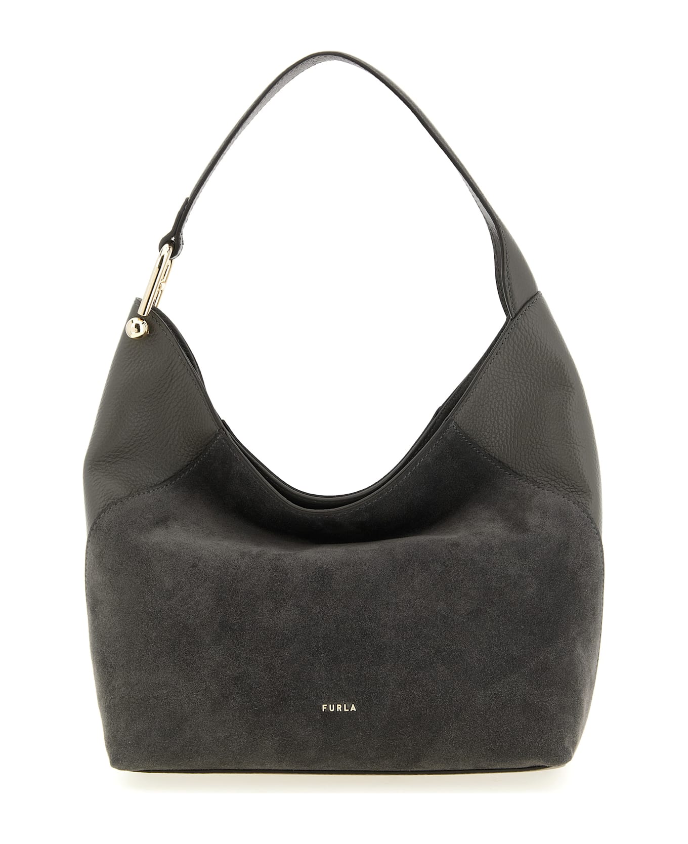 'Furla Lara' medium shoulder bag in suede and smooth tone-on-tone calf leather, front metal lettering logo, magnetic closure, fixed handle with iconic Arco logo with metal ball element.