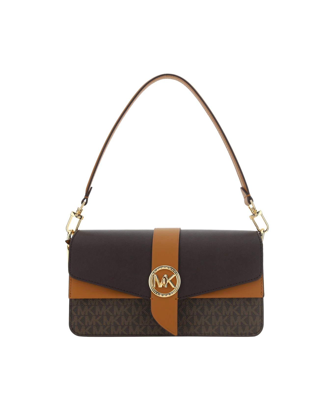 Greenwich shoulder bag by michael kors, front swivel closure, iconic brand monogram embossed on front, single interior compartment, two welt pockets inside, all-over contrasting repeated iconic brand monogram design, chain shoulder strap with sliding leather part.