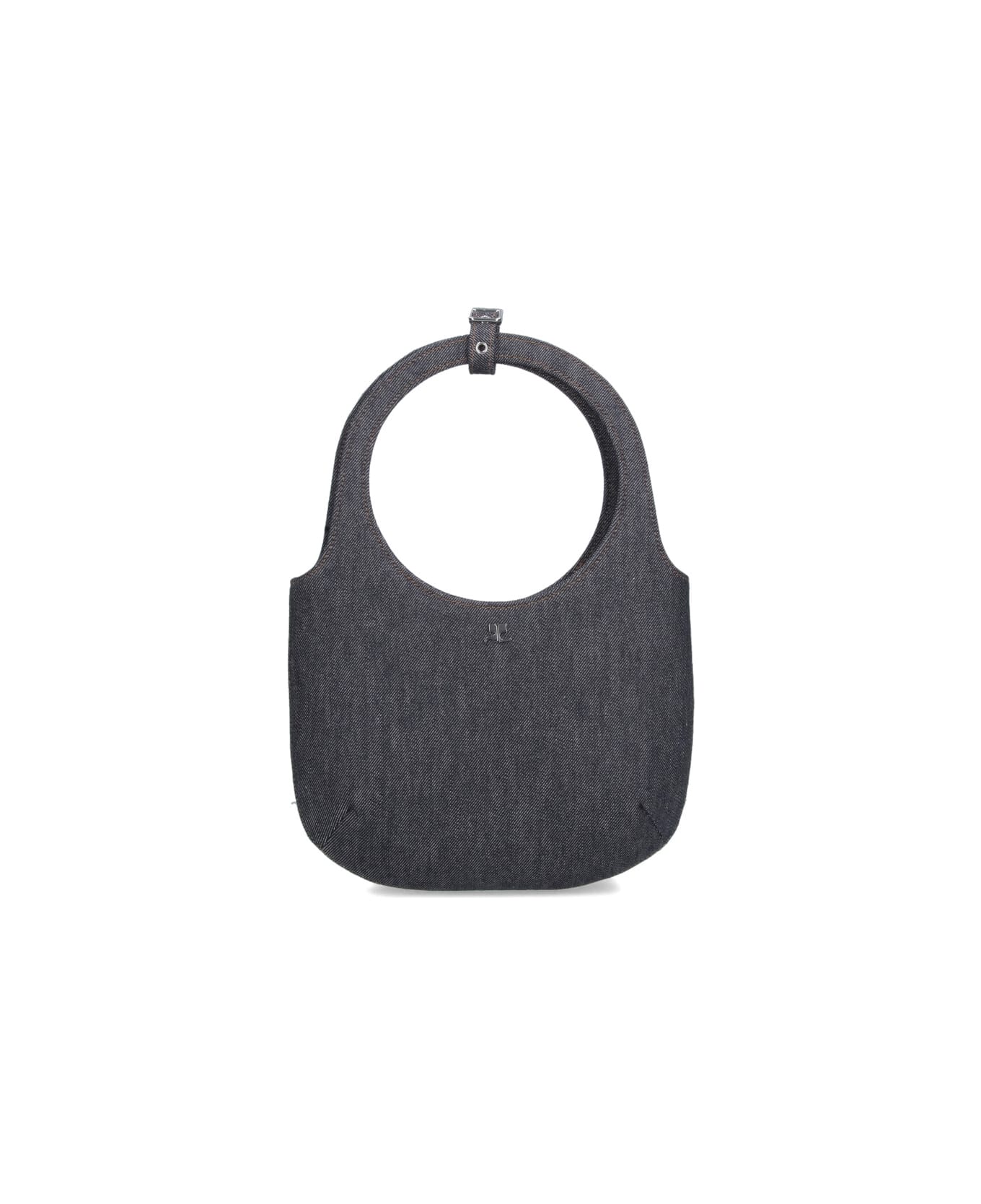 Courrèges gray 'Holy' denim handbag with two handles, adjustable strap detail, adjustable and removable shoulder strap, magnetic button closure, silver metal logo on the front, inner flat pocket, main inner compartment.