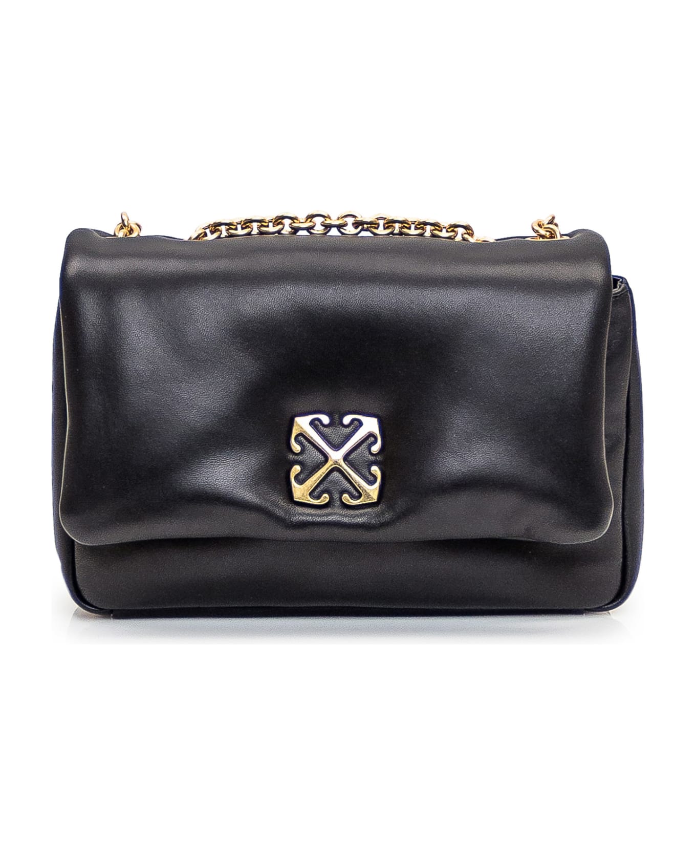 Black leather shoulder bag. Shoulder strap with chain. Internal pocket with zip. Flap closure with Arrow flap. Logo on the back.