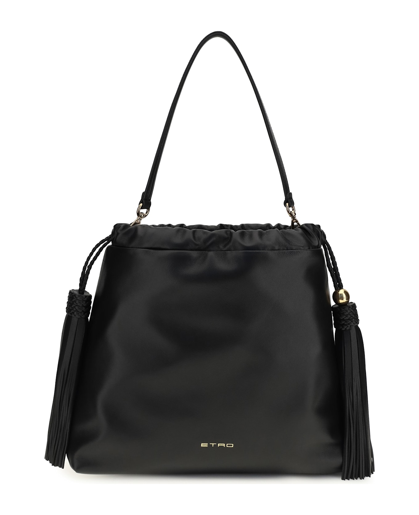 The kalispera leather shoulder bag by etro is an elegant and versatile accessory, featuring a braided drawstring closure that ends at both ends with refined tassels embellished with long fringes. the model features a removable handle, an internal wall pocket for organizing essential items, and gold-finish metal elements that add a bright and sophisticated touch. perfect for completing everyday looks and more sophisticated outfits.