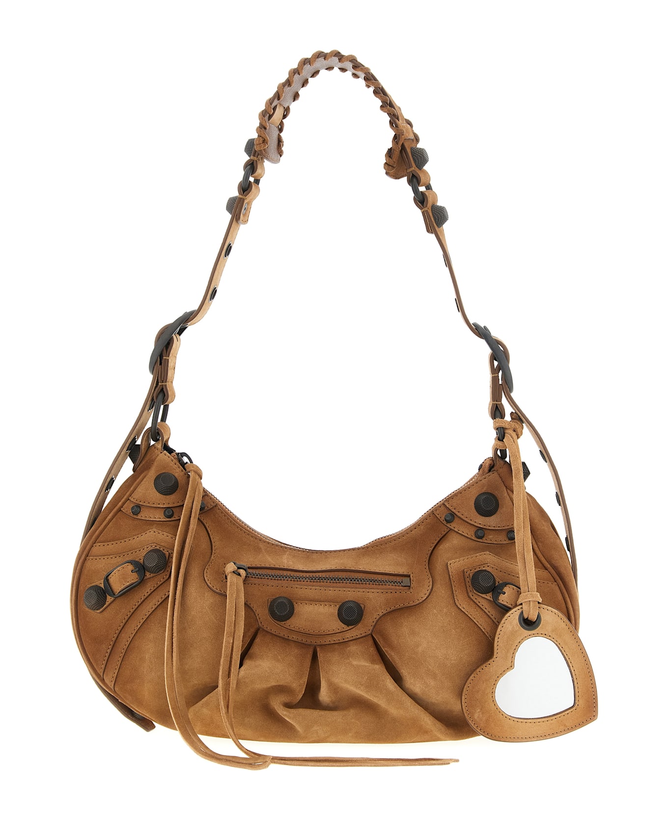 'Le Cagole S' crescent-effect suede shoulder bag with brass finish studs, adjustable handle, woven leather shoulder pad, top zip closure, front and back zip pocket, base with metal feet, removable heart mirror, cotton canvas lining.