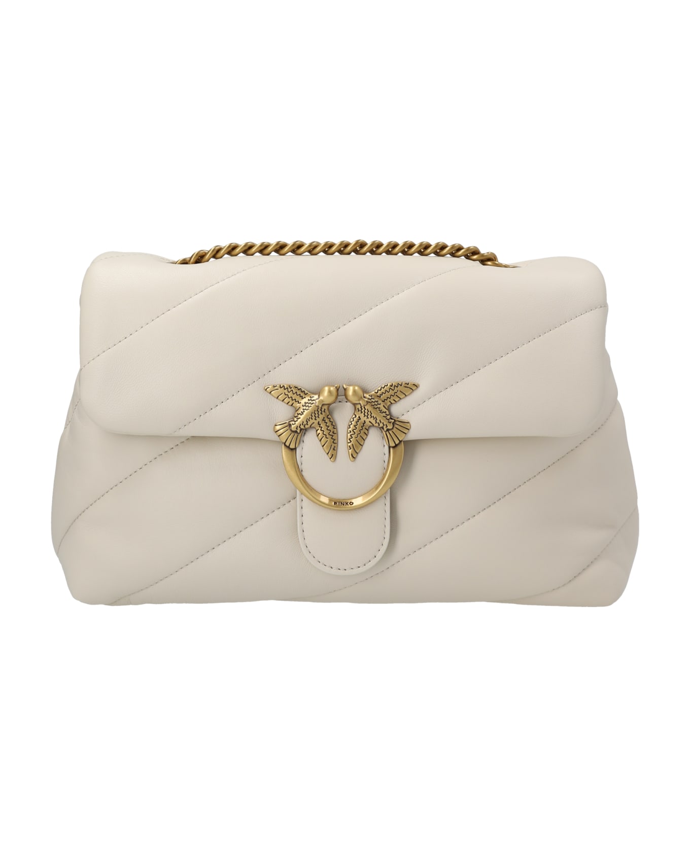 Bianco seta-antique gold 'love Classic Puff' Crossbody Bag from Pinko Love Classic Puff' quilted leather crossbody bag with flap closure with front metal logo appliqué, chain and leather shoulder strap.