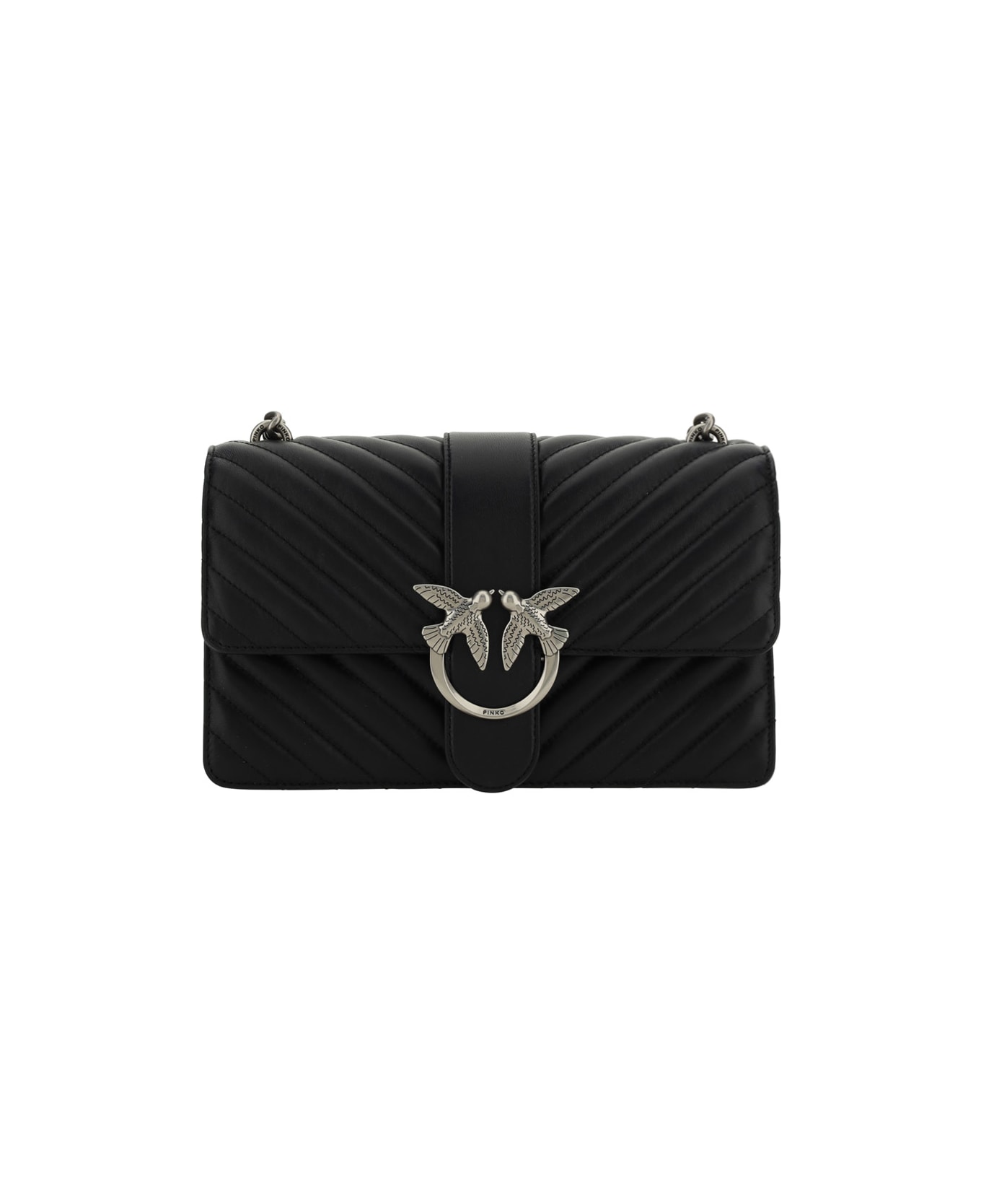 Calfskin love one classic shoulder bag by pinko, front closure with magnetic button, iconic love birds logo embossed on the front, all-over quilted design, single internal compartment, chain shoulder strap with adjustable leather detail, iconic brand monogram embroidered tone-on-tone on the back.