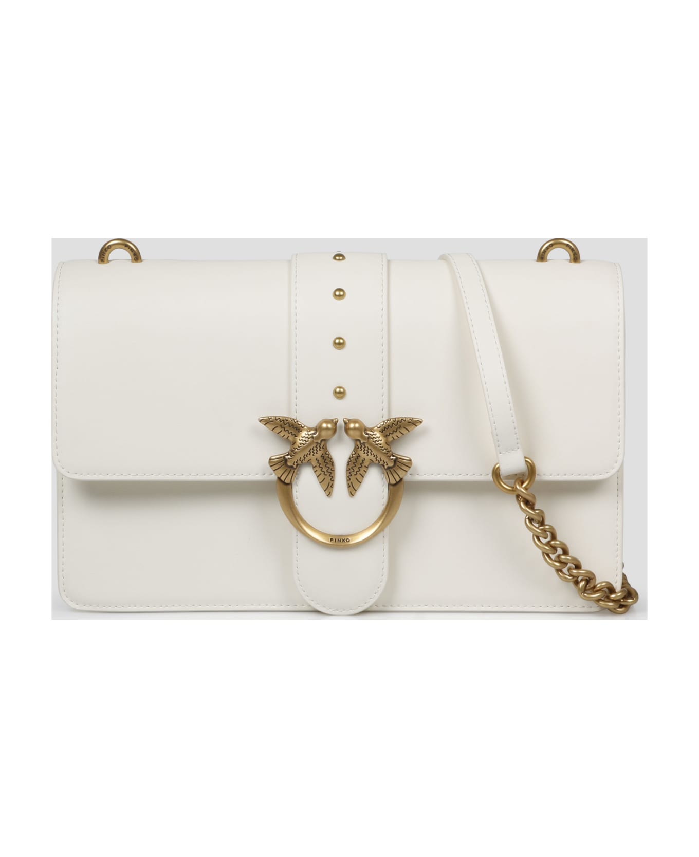 Pinko Mini Love Bag Icon in silky-feel leather embellished with the iconic metal Love Birds Diamond Cut buckle. - W: 21cm H: 13cm D: 6cm - Removable chain shoulder strap - Studded leather strap fastening - Inside: 2 main compartments, 1 zipped compartment, 1 flat pocket - Antique gold toned metal hardware - Made in China - 100% cow leather