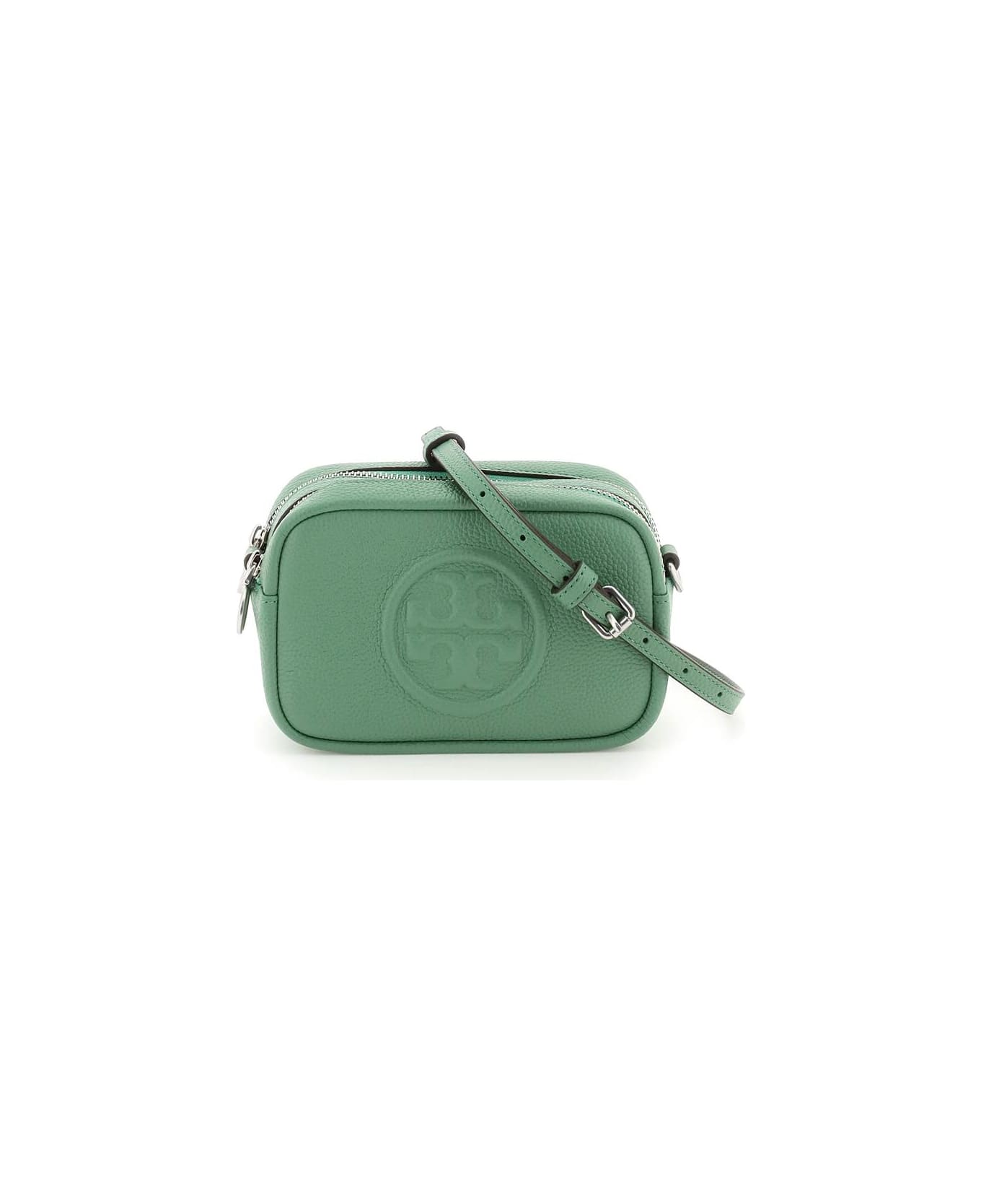 Perry Bombe mini camera bag in grained leather by Tory Burch, featuring double T monogram embossed on the front. Adjustable and removable shoulder strap, two independent zipped compartments and one back flat pocket with magnetic closure. Fabric lining and one inner open flat pocket. Steel-finished metalware.