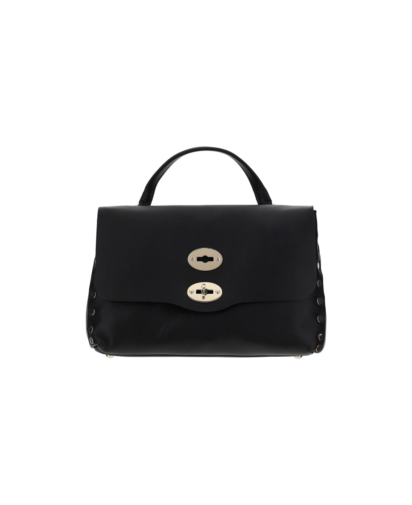 Calfskin postina heritage bag by zanellato, front hook-and-eye closure, short leather handle, removable and adjustable shoulder strap, grained leather design, contrasting metallic studded trim, single interior compartment, interior flat pocket with zipper.
