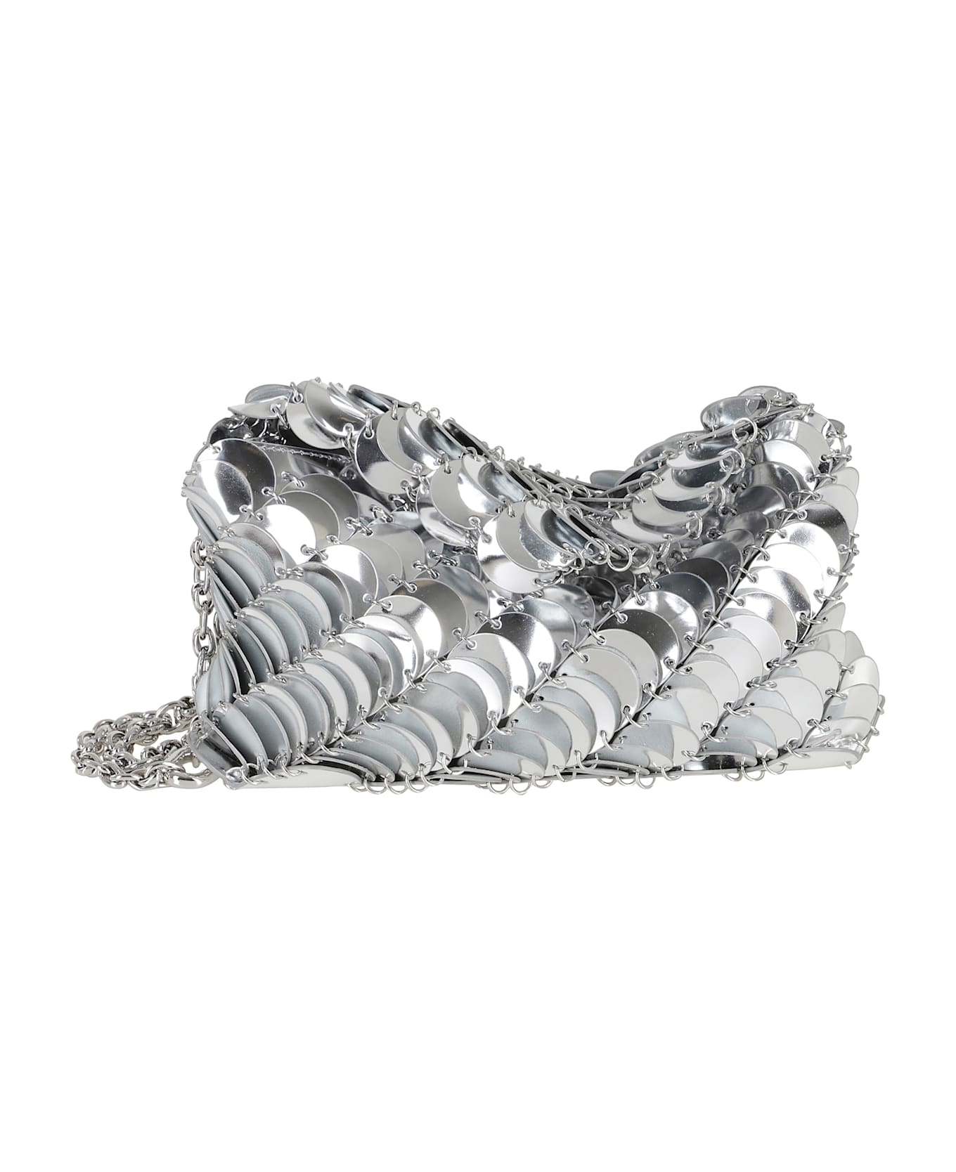 Category: Bags Item: paco night bag Brand: Rabanne Color: Silver Details: Brown cotton twill lining, sliding chain and metal parts Closure: Magnetic snap closure SIZE & FIT Width: 28 cm Height: 17 cm Depth: 10 cm