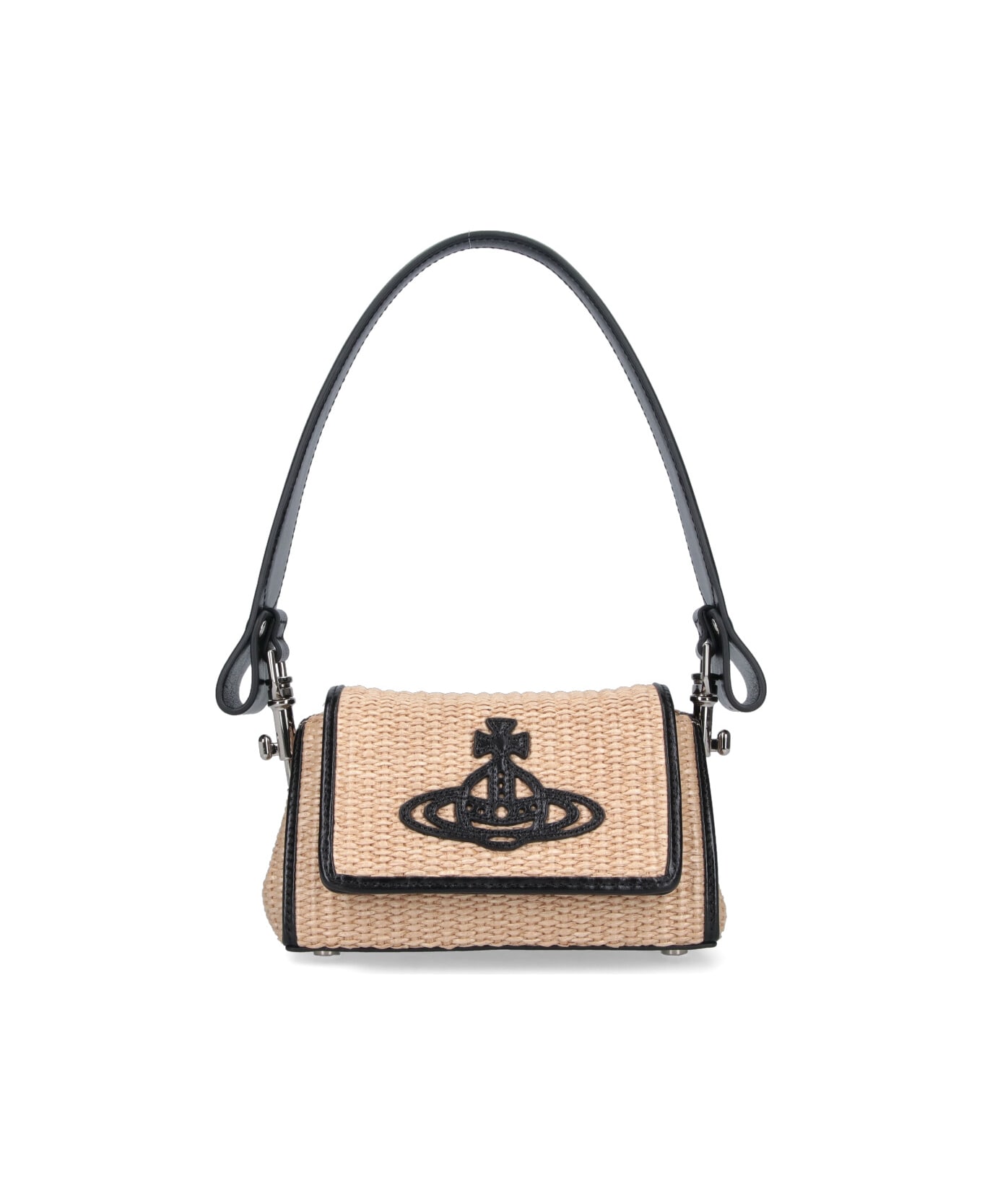 Small shoulder bag "Hazel" by Vivienne Westwood in beige cotton blend, featuring a top handle, flap closure, contrasting maxi "Orb" logo on the front, and a single main internal compartment. Composition: 58% Cotton, 42% Polyamide