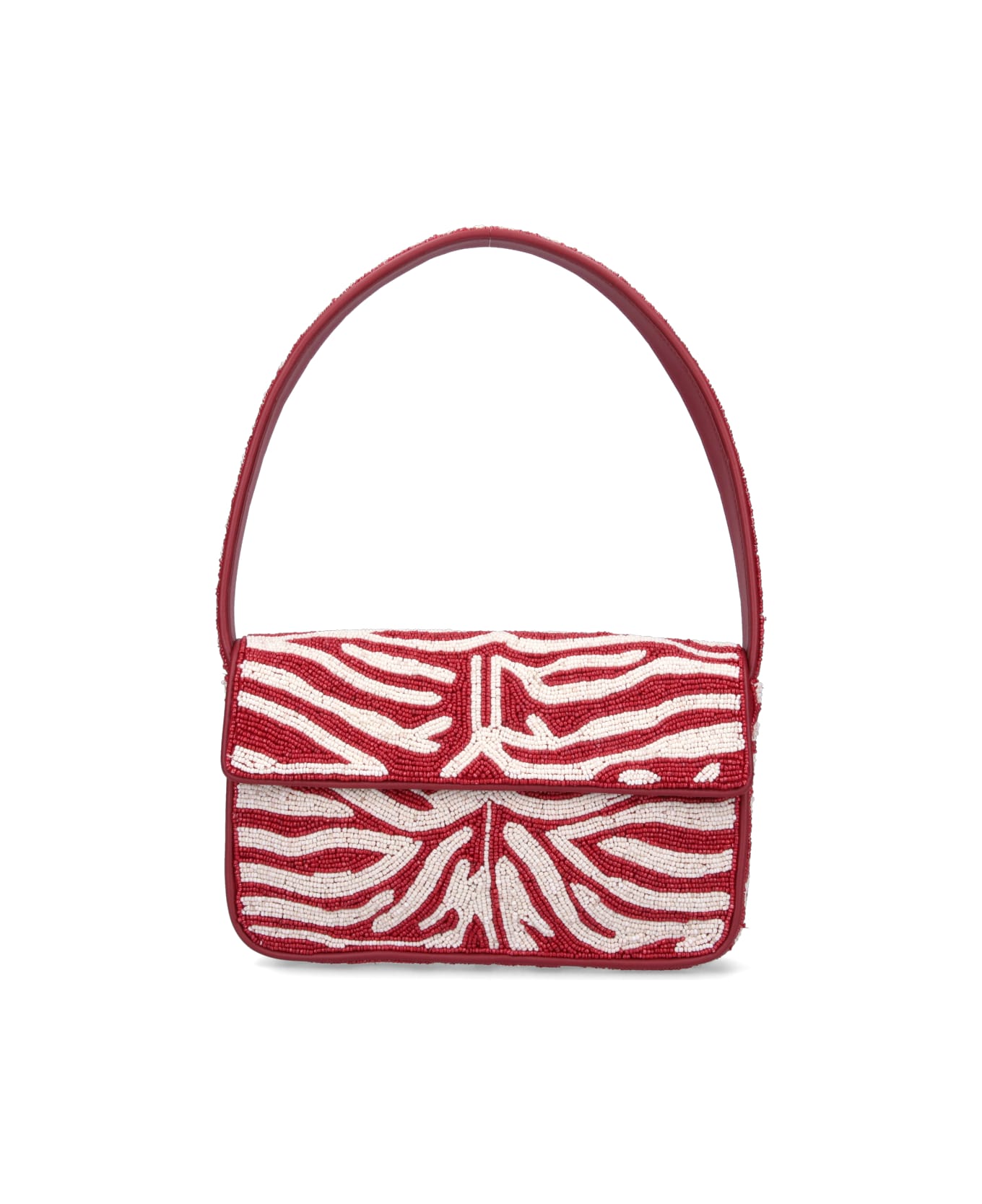 Staud 'Tommy' red shoulder bag - made of vegan leather - with all-over red beads hand decoration, white beads detail, top handle, magnetic closure, back flat pocket, back logo lettering, inner zip pocket, main inner compartment.