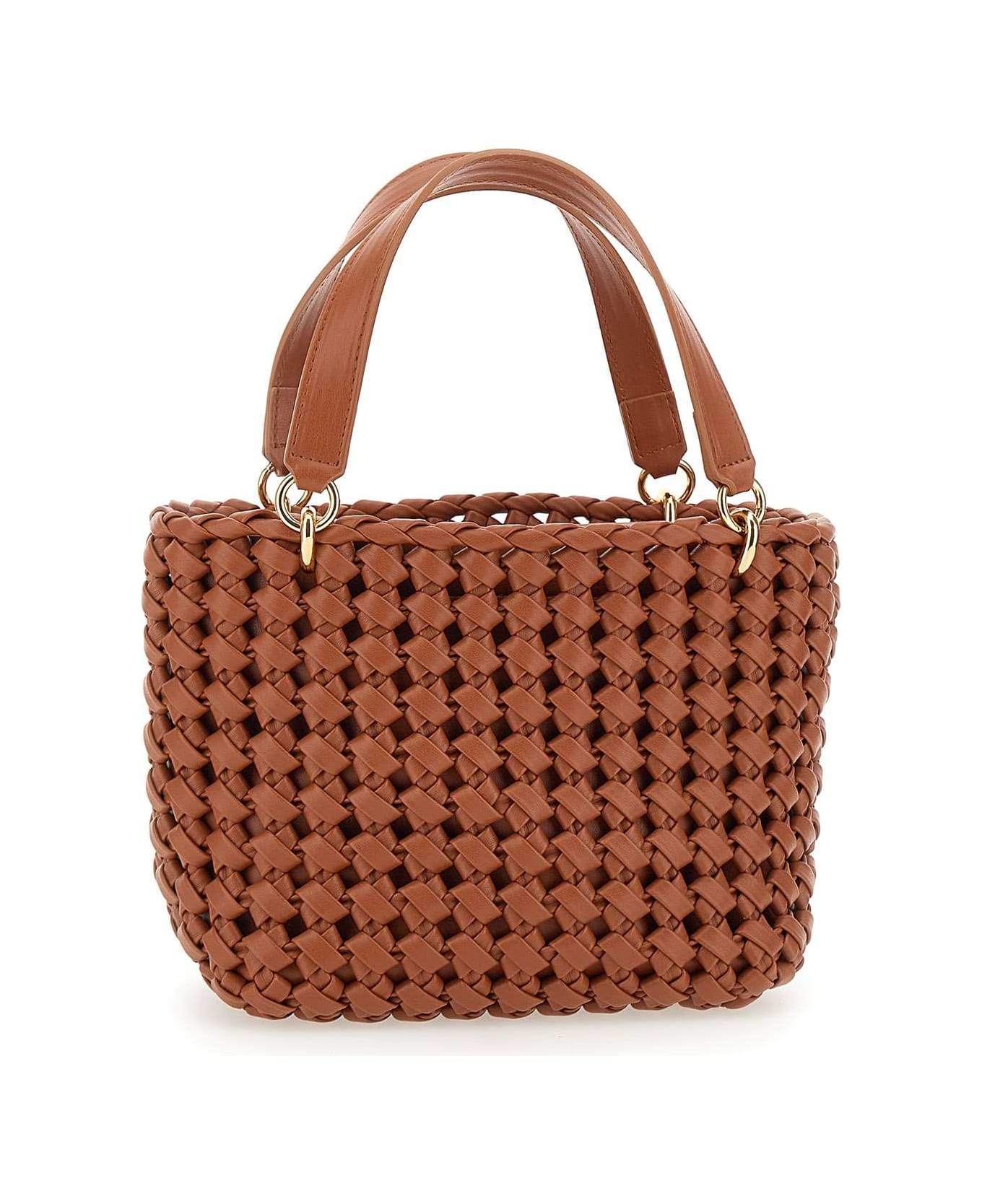 Themoire "Kobo Knots" vegan leather handbag, tan color, woven work, fastening with logoed bridge and magnets, removable and adjustable shoulder strap 90 cm, lined, double top handle, inside slip pocket Measures:length 20cm, height 15cm, depth 10cm. Dustbag included. Vegan PU is an environmentally friendly alternative to PVC as it does not require same chemical plasticizers to be produced and is more biodegradable over time.