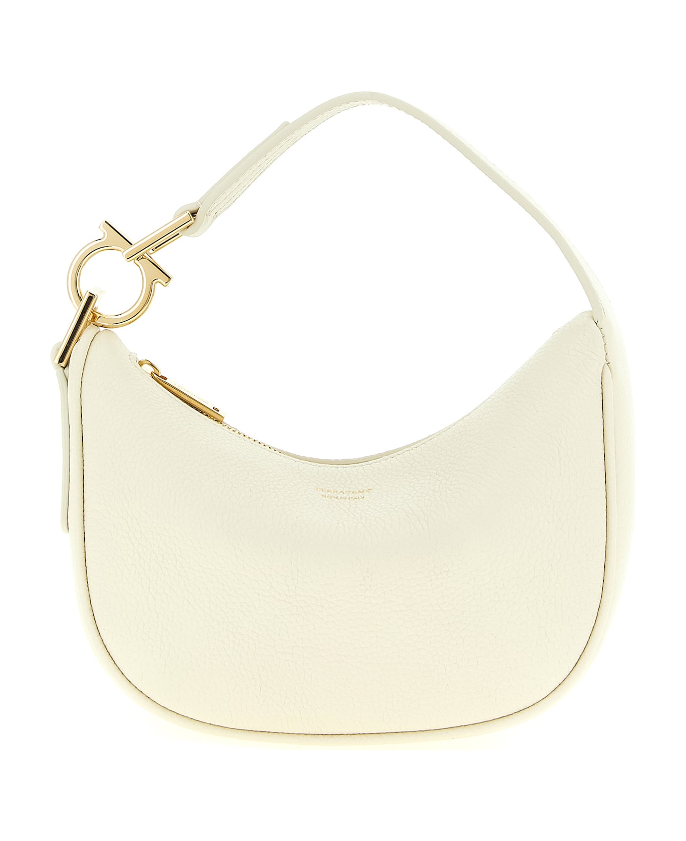 Hammered leather handbag with front embossed logo, top zip closure, fixed handle with side metal 'Gancini' detail.