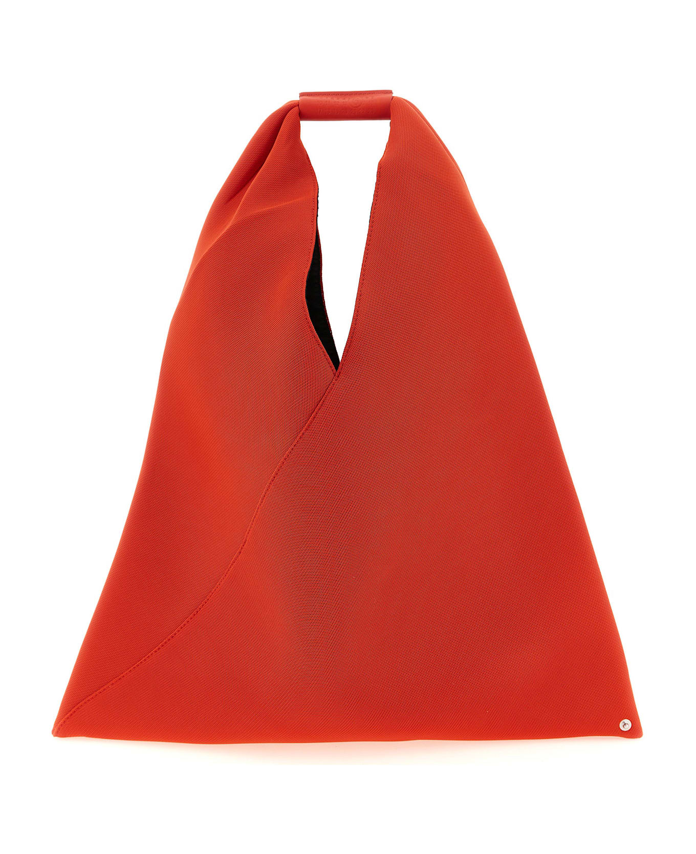 'Japanese Classic' mesh handbag, origami-inspired triangle pleats with snap buttons, fixed leather handle with embossed 'Numeric signature MM6', inner snap button closure, 'White stitch line' at the back.