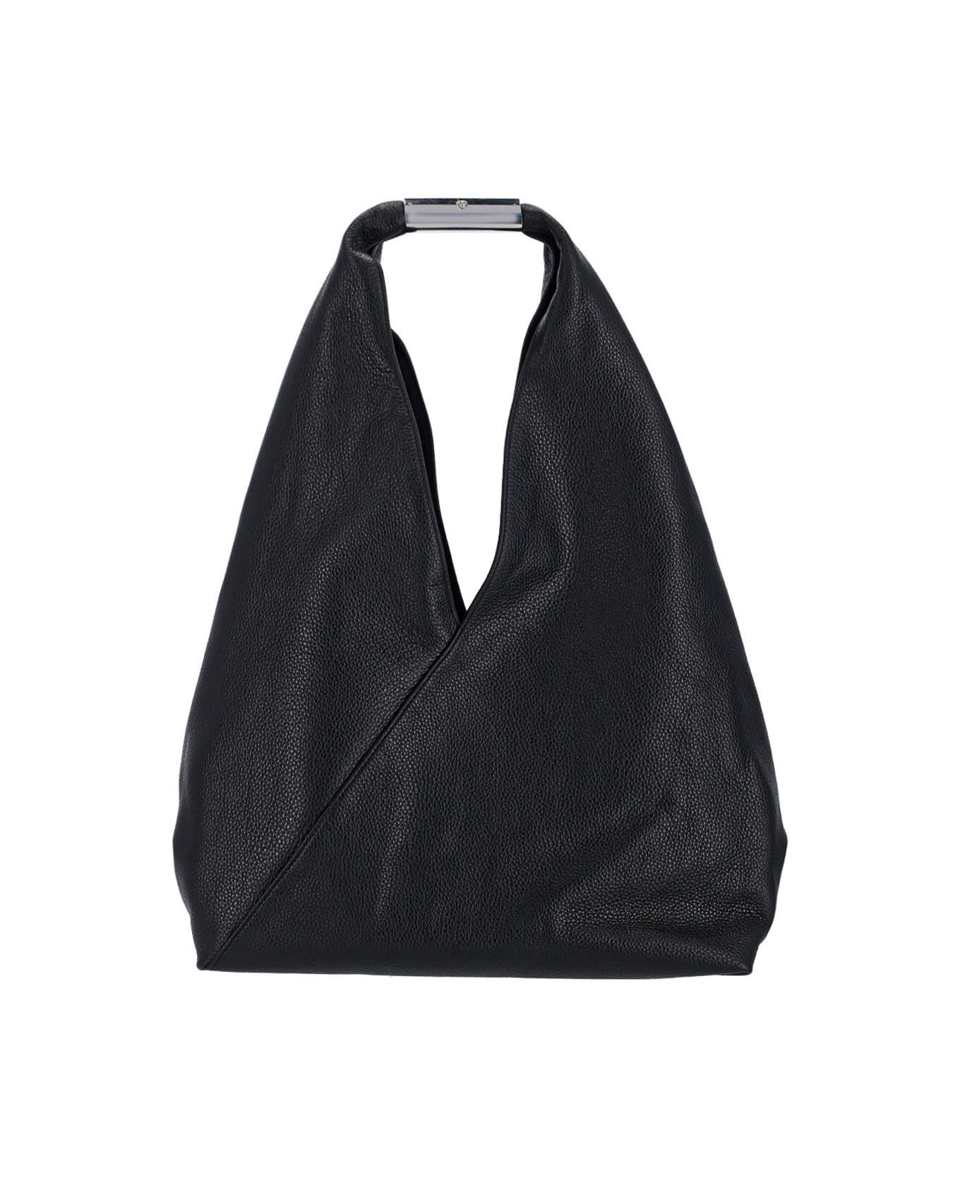 MM6 Maison Margiela 'Japanese' large shoulder bag in black hammered calf leather, silver metal top handle, numeric logo detail engraved on the handle, stitching detail at the back, main inner compartment.