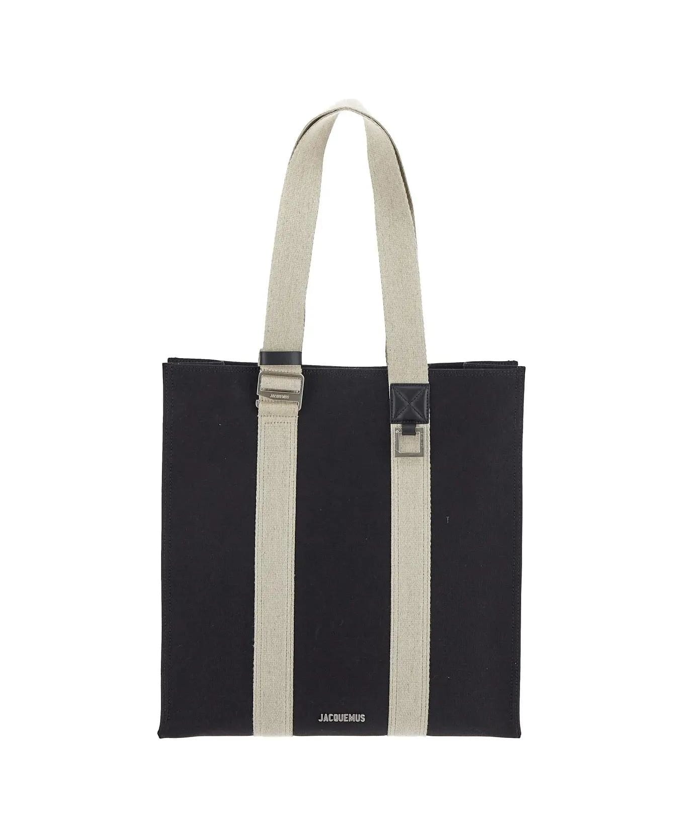 Jacquemus tote bag in black cotton canvas with beige grosgrain top handles extended to the bottom, metallic logo plaque, leather details, silver-finish hardware, a back patch pocket, snap button fastening, inner zipped pocket and a flat pocket, branded buckle and engraved square carabiner pendant. Composition: 100% Cotton