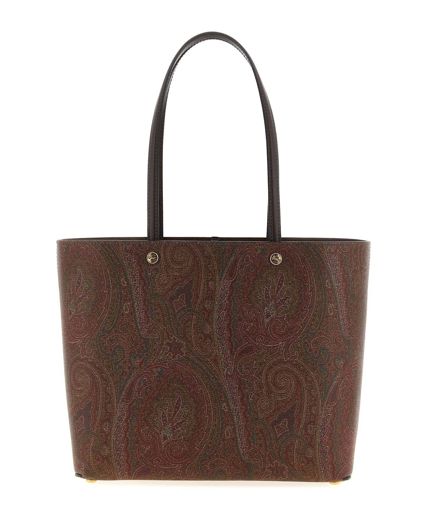 Medium 'Etro Essential' shopping bag in matt-grain coated Paisley jacquard cotton fabric with canvas doubling, double fixed leather handle with engraved logo button detail, snap hook closure, removable matching clutch bag. Composition: 76% cotton, 24% polyester