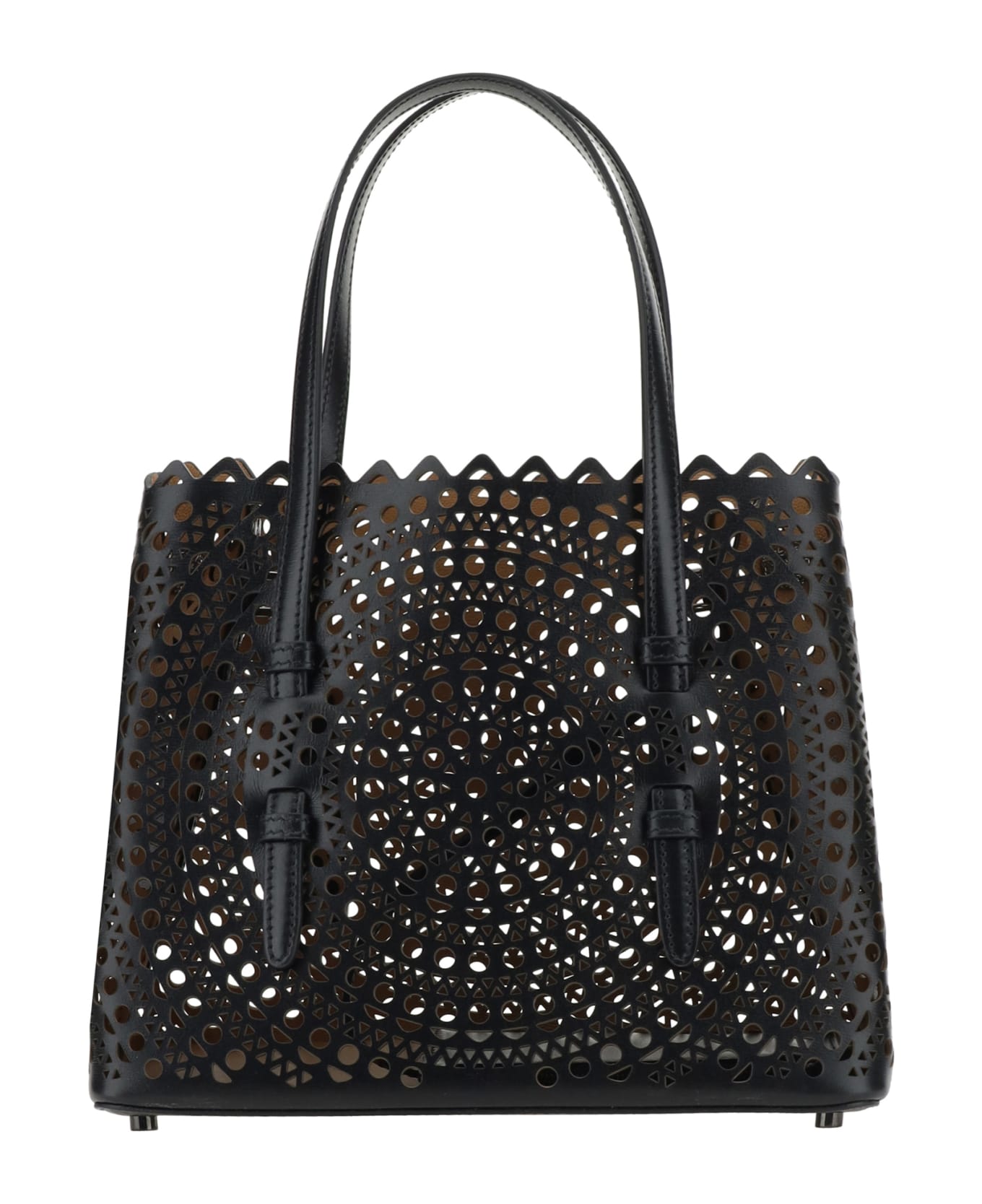 Calfskin mina 25 handbag by alaïa, double flat top handles, the brand's iconic neo vienne design with all-over cut-out effect, support feet attached to base of bag.