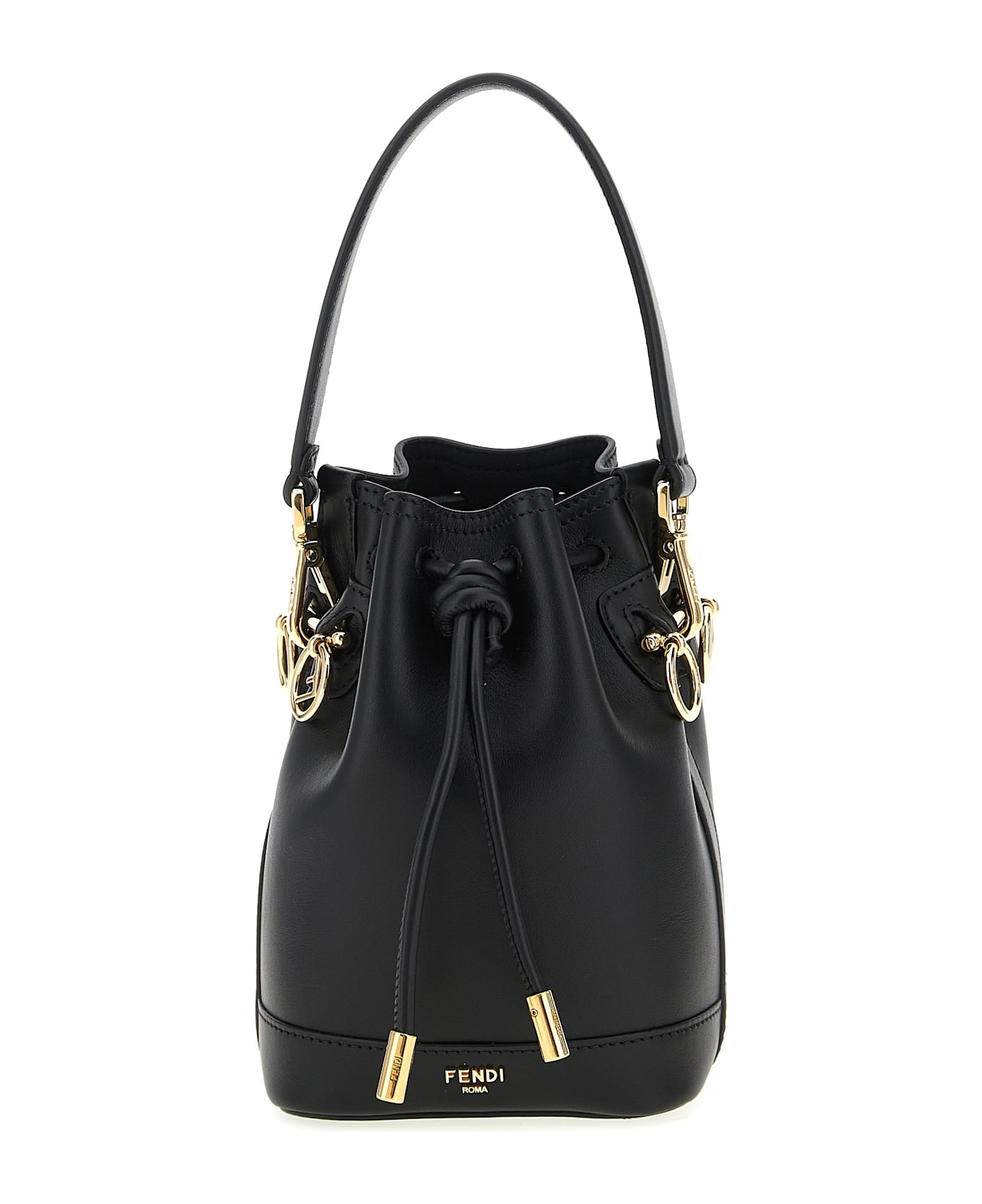 'Mon Tresor' mini bucket bag in calf leather, front lettering logo and metal details with gold finish, drawstring closure, removable handle, removable shoulder strap.
