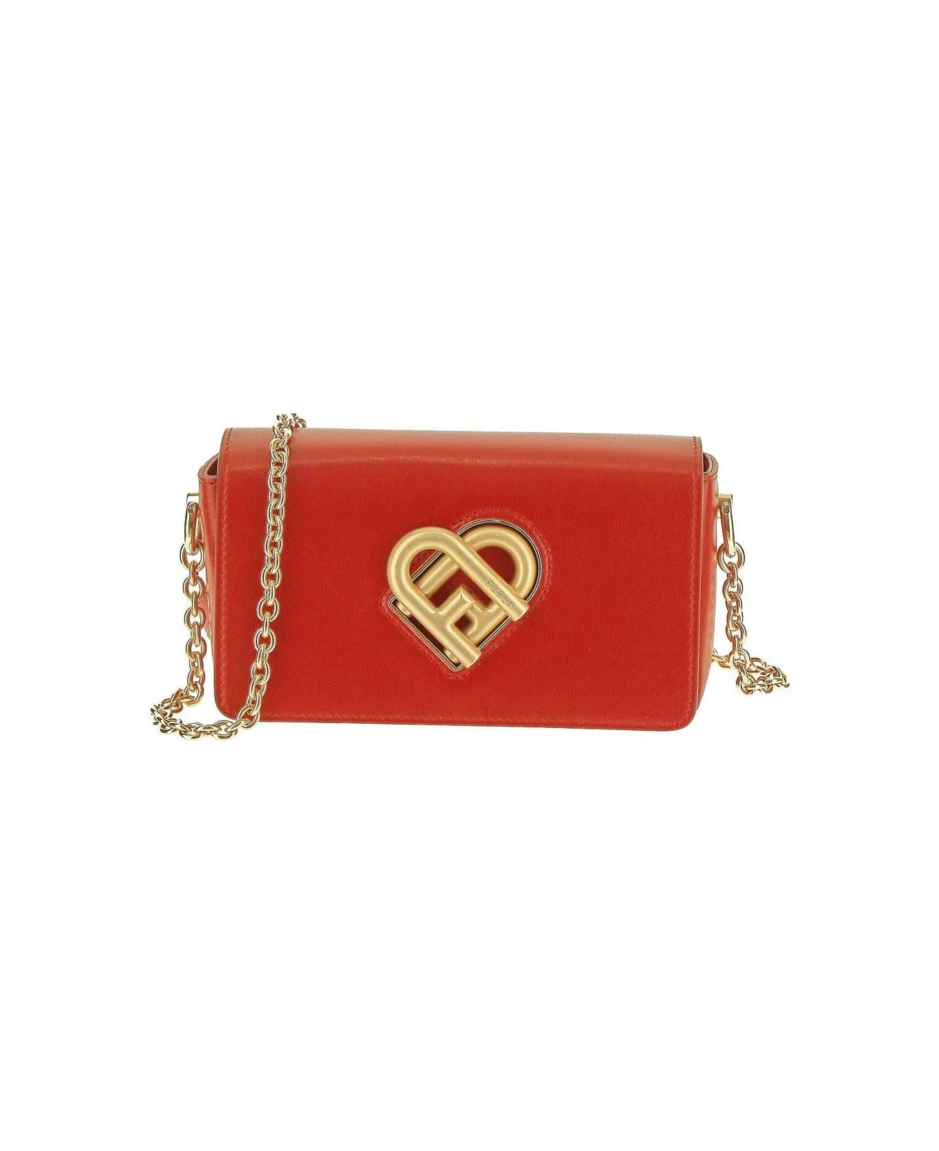 Furla bag in red leather with gold-tone heart-shape closure. The item is featured by chained shoulder strap, and gold-tone hardware.