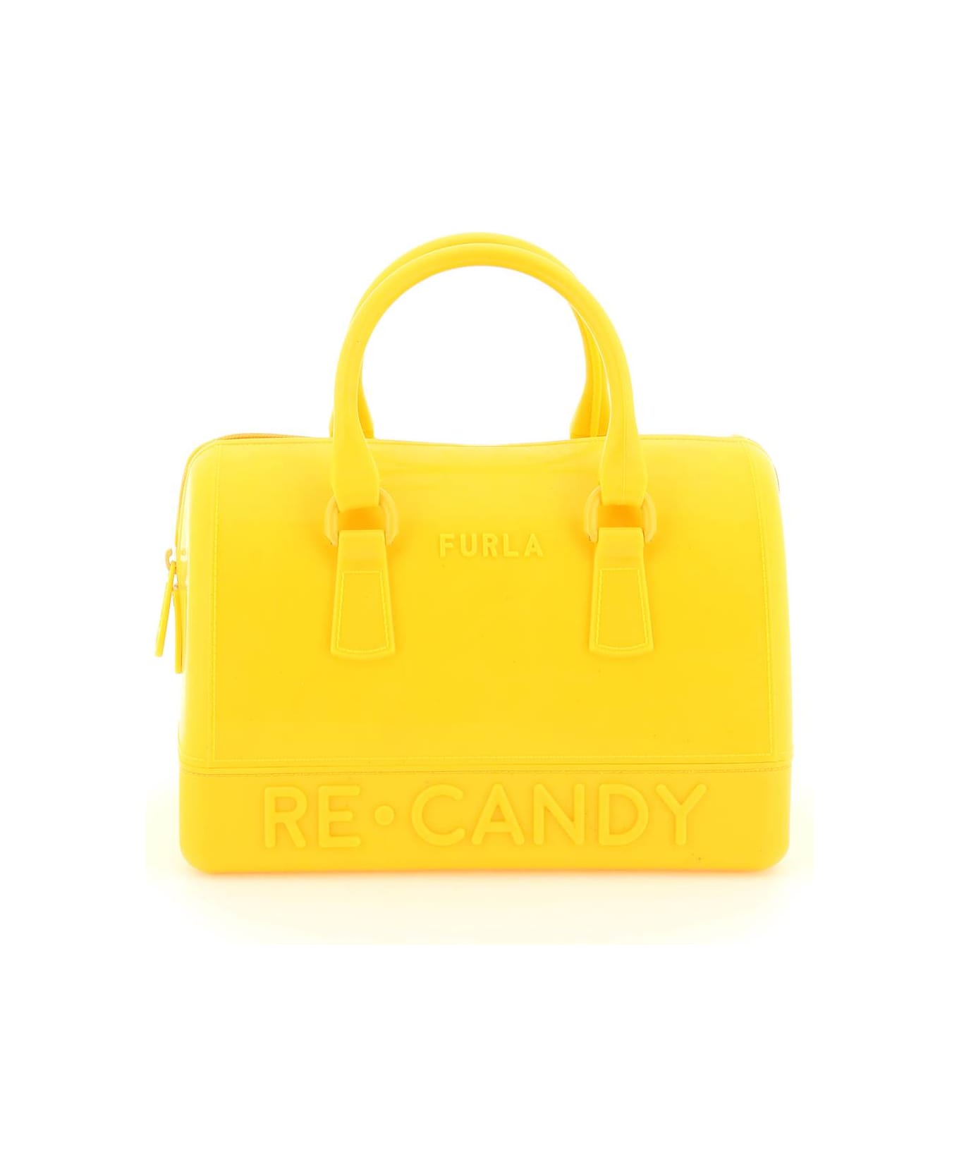 Candy Boston S bag by Furla crafted in recycled TPU with embossed "RE-CANDY" lettering on front and back, double top handle with tone-on-tone recycled ABS details and zip closure. Embossed lettering logo on front and on the zip puller. Unlined.