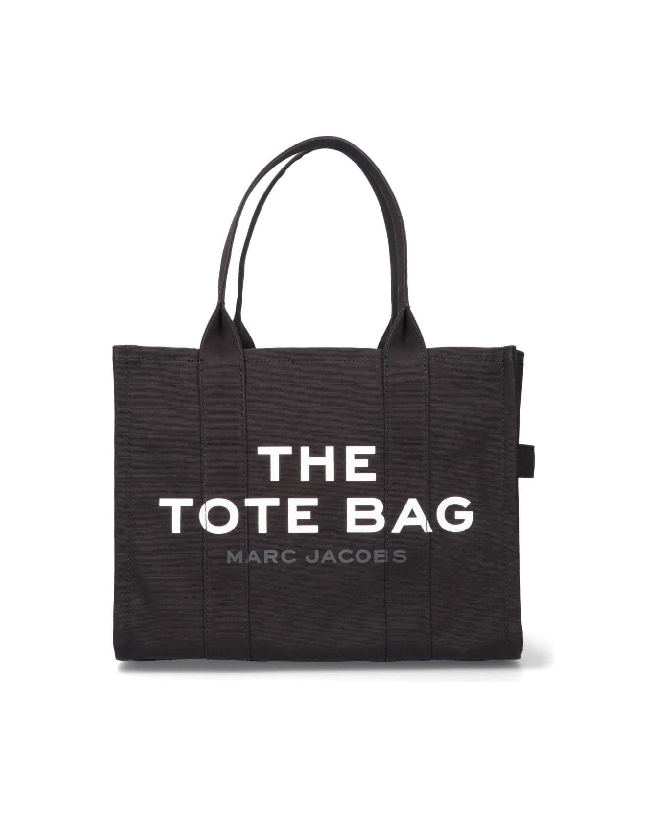 Marc Jacobs 'The Large Tote' Bag, black fabric, two top handles, top zipper closure, white logo print on front, one side handle, back logo label, one inside zipper pocket, two inside pockets, one main compartment.