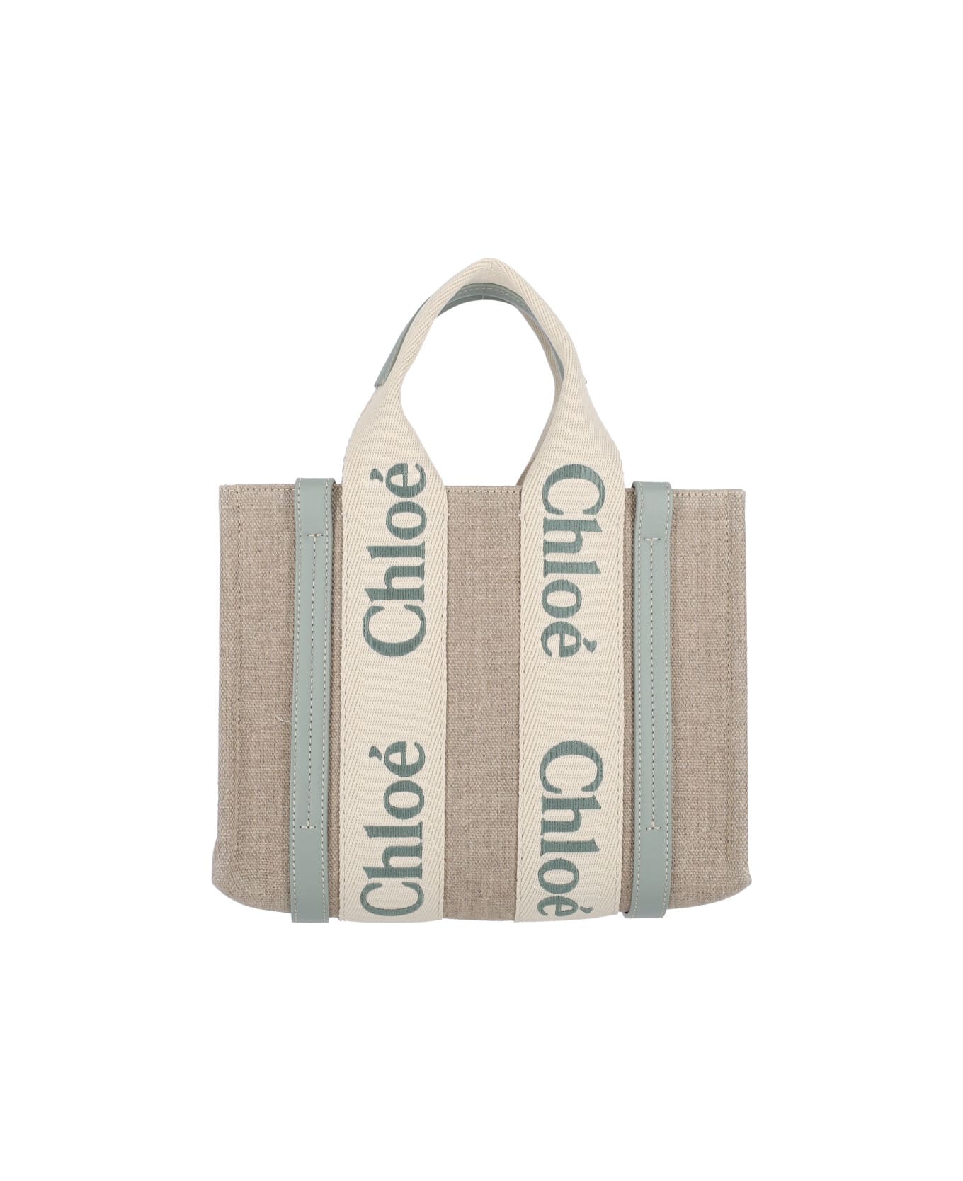 Chloé Woody small tote bag in beige linen with calf leather trim, two handles, logo embroidery pattern, adjustable and removable shoulder strap, inner flat pocket, main inner compartment. Composition: 100% Calf Leather