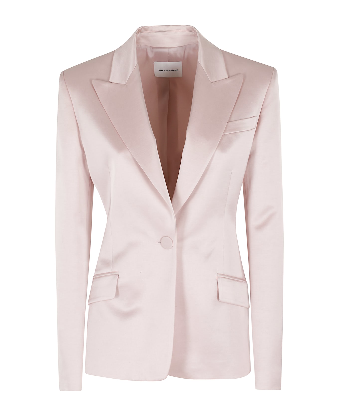 Category: Jacket - Blazer Item: White Brand: The andaman Color: Pink Neckline: Spear lapels Pockets: Two front and a breast pocket Details: Shiny effect Closure: Single breasted SIZE AND FIT Fit: Regular Sleeve length: Long