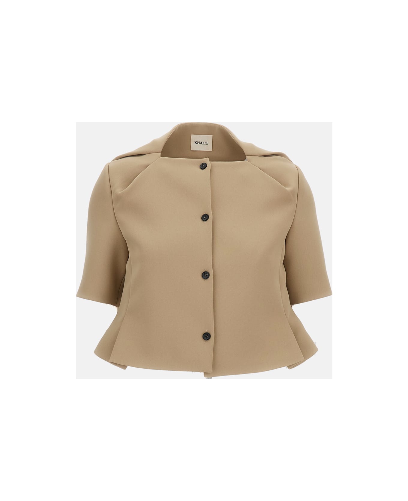 Peplum jacket tailored in bonded Italian crepe Flared silhouette with waist pleats Elbow-length sleeves Slim fit Geometric collar Front button fastening Silk lining Color: beige Made in Italy Composition: 100% Polyester
