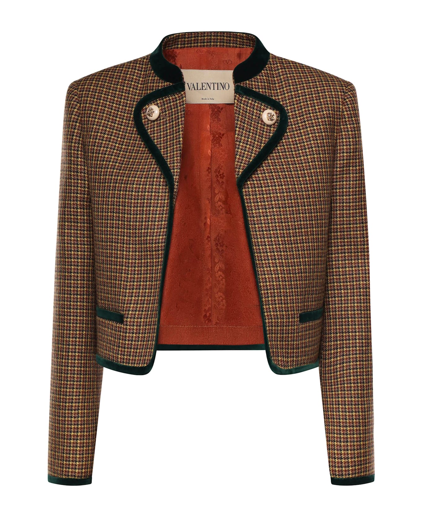 - Made of virgin wool - Velvet inserts - Long sleeves - Inner shoulder pads - Made in Italy - Size shown is 40 - Color: Yellow, Brown, Beige, Black
