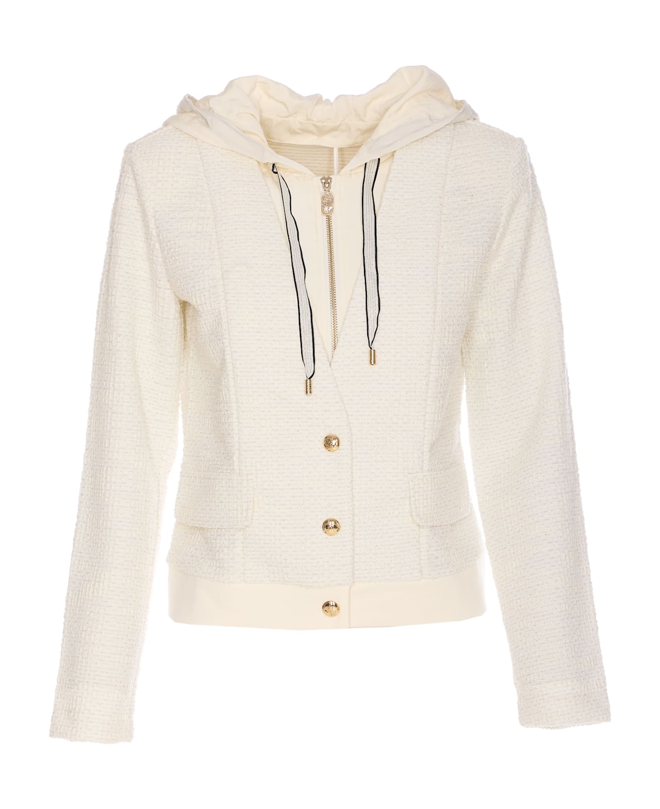Liu Jo white jacket with frontal zip closure, hood with coulisse, button closure, long sleeves, reinforced shoulder, tweed effect Composition: 58% Polyester, 36% Cotton, 5% Metallised Polyester