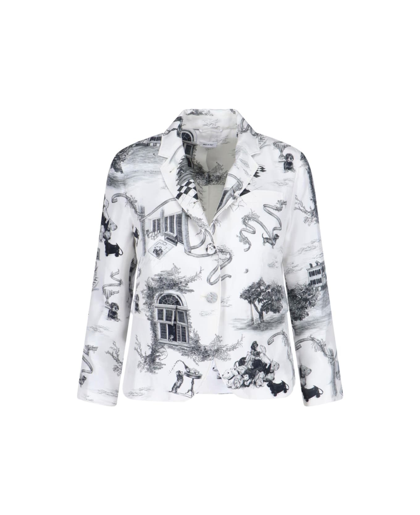 Silk blazer "Hector" by Thom Brown, white, lapels, single-breasted front closure, long sleeves, all-over print. Composition: 100% Silk